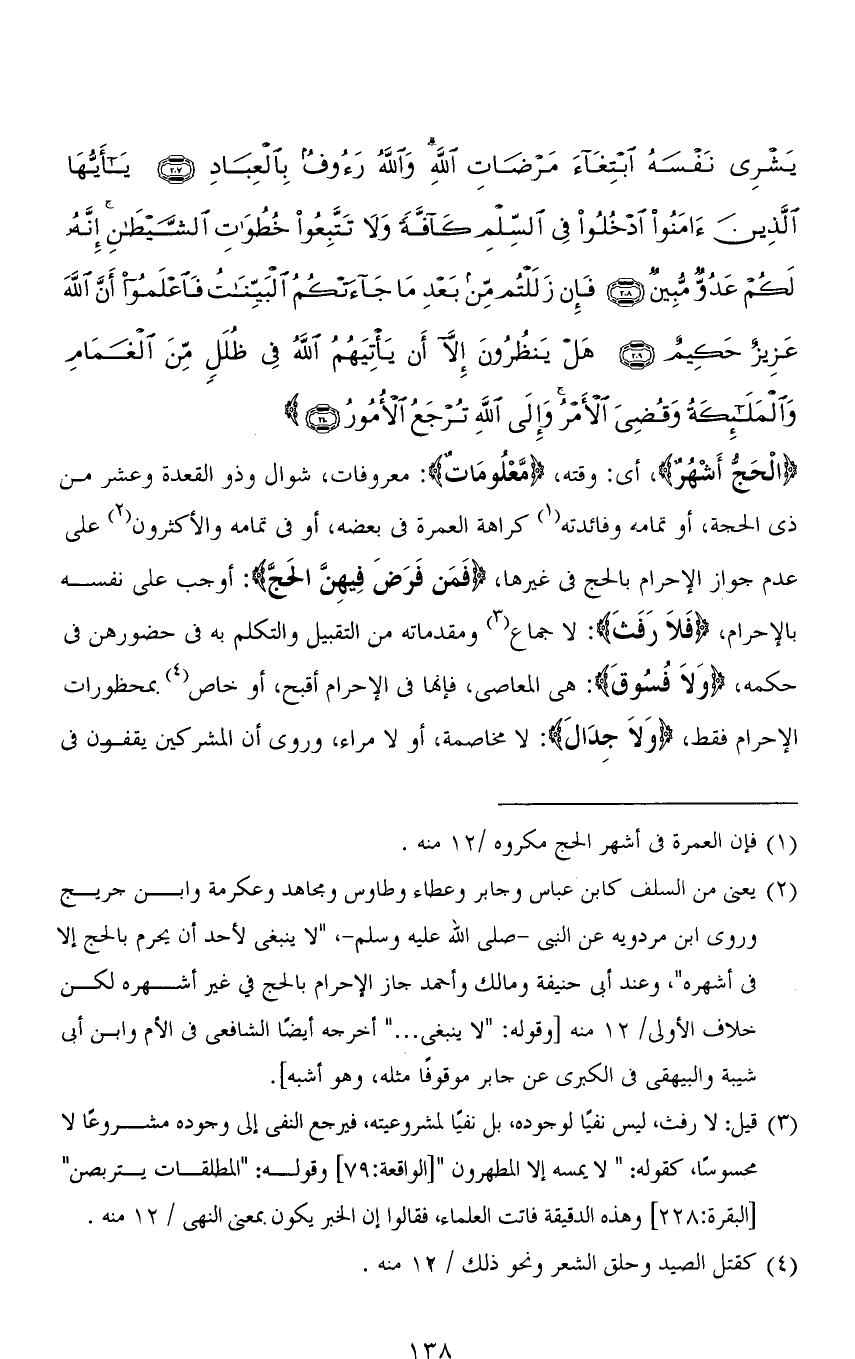 (الْحَجُّ أَشْهُرٌ)، أي: وقته، (مَّعْلُومَاتٌ): معروفات، شوال وذو القعدة وعشر من ذي الحجة، أو تمامه وفائدته كراهة العمرة في بعضه، أو في تمامه والأكثرون على عدم جواز الإحرام بالحج في غيرها، (فَمَنْ فَرَضَ فِيهِنَّ الْحَجَّ): أوجب على نفسه بالإحرام، (فَلَا رَفَثَ): لا جماع ومقدماته من التقبيل والتكلم به في حضورهن في حكمه، (وَلاَ فُسُوقَ): هي المعاصي، فإنها في الإحرام أقبح، أو خاص بمحظورات الإحرام فقط، (وَلاَ جِدَالَ): لا مخاصمة، أو لا مراء، وروي أن المشركين يقفون في