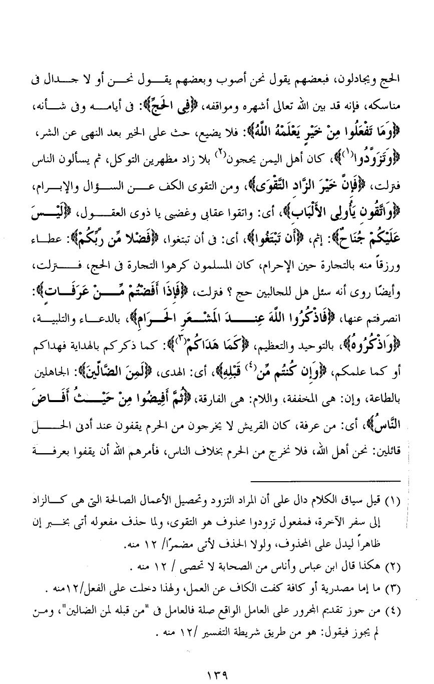 الحج ويجادلون، فبعضهم يقول نحن أصوب وبعضهم يقول نحن [أبر] (1) أو لا جدال في مناسكه، فإنه قد بين الله تعالى أشهره ومواقفه، (في الحَجِّ): في أيامه وفي شأنه، (وَمَا تَفْعَلُوا مِنْ خَيْر يَعْلَمْهُ اللهُ): فلا يضيع، حث على الخير بعد النهي عن الشر، (وَتَزودُوا)، كان أهل اليمن يحجون بلا زاد مظهرين التوكل، ثم يسألون الناس فنزلت، (فَإن خَيْرَ الزَّادِ التَّقْوَى)، ومن التقوى الكف عن السؤال والإبرام، (وَاتَّقُونِ يَا أُولِي الْأَلْبَابِ)، أي: واتقوا عقابي وغصبي يا ذوي العقول، (لَيْس عَلَيْكُمْ جُنَاحٌ): إثم، (أًن تَبْتَغوا)، أي: في أن تبتغوا، (فَضلاً مِّن ربِّكُمْ): عطاء ورزقًا منه بالتجارة حين الإحرام، كان المسلمون كرهوا التجارة في الحج، فنزلت، وأيضًا روي أنه سل هل للجالبين حج؟ فنزلت، (فَإِذَا أَفَضْتُمْ مِنْ عَرَفَاتٍ):