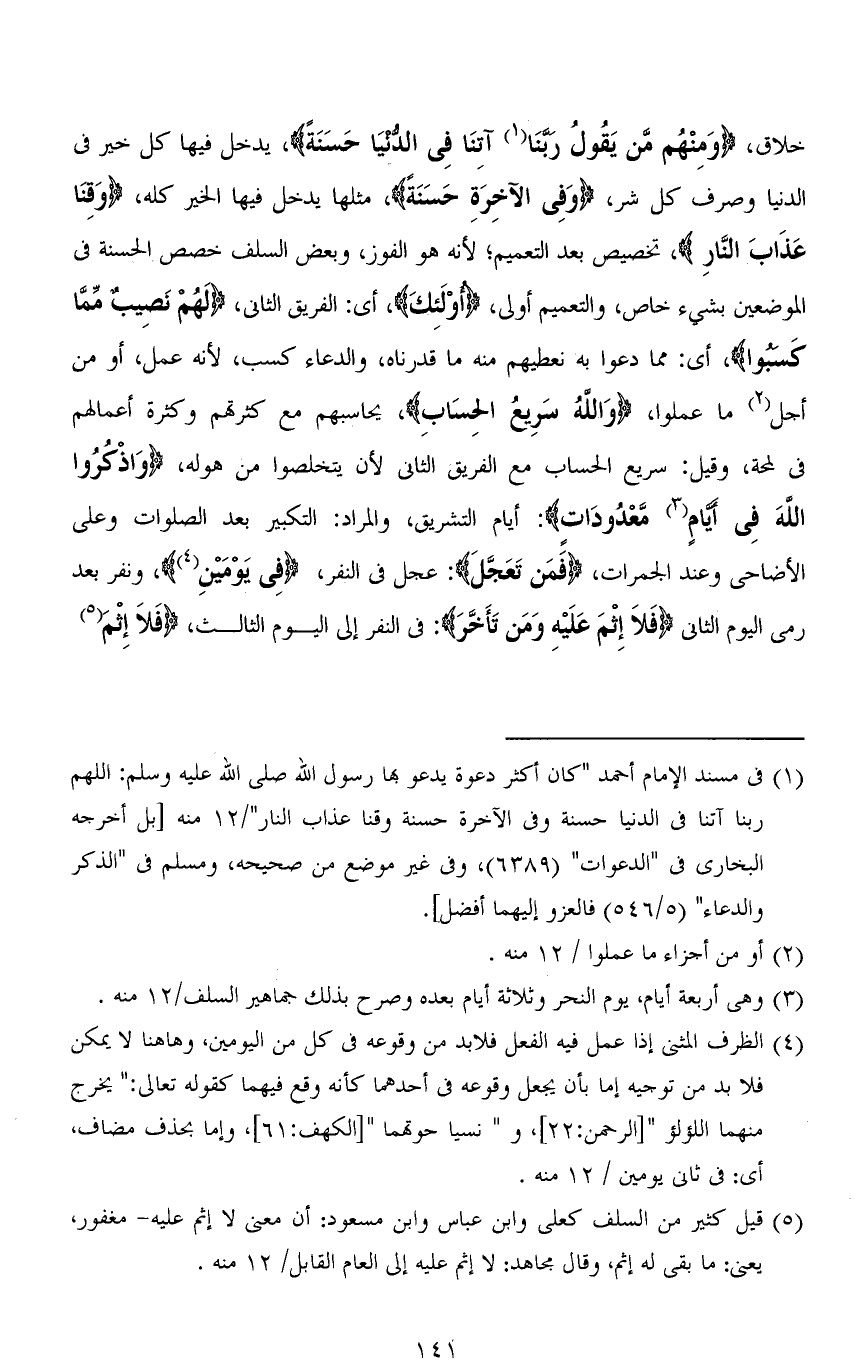 خلاق، (وَمِنْهُمْ مَنْ يَقُولُ رَبَّنَا آتِنَا فِي الدُّنْيَا حَسَنَةً)، يدخل فيها كل خير في الدنيا وصرف كل شر، (وَفِي الْآخِرَةِ حَسَنَةً)، مثلها يدخل فيها الخير كله، (وَقِنَا عَذَابَ النَّارِ)، تخصيص بعد التعميم؛ لأنه هو الفوز، وبعض السلف خصص الحسنة في الموضعين بشيء خاص، والتعميم أولى، (أُولَئِكَ)، أي: الفريق الثاني، (لَهُمْ نَصِيبٌ مِمَّا كَسَبُوا)، أي: مما دعوا به نعطيهم منه ما قدرناه، والدعاء كسب، لأنه عمل، أو من أجل ما عملوا، (وَاللهُ سَرِيعُ الْحِسَابِ)، يحاسبهم مع كثرتهم وكثرة أعمالهم فى لمحة، وقيل: سريع الحساب مع الفريق الثاني لأن يتخلصوا من هوله، (وَاذْكُرُوا اللهَ فِي أَيَّامٍ مَعْدُودَاتٍ): أيام التشريق، والمراد: التكبير بعد الصلوات وعلى الأضاحى وعند الجمرات، (فَمَن تَعَجَّلَ): عجل في النفر، (فِى يَوْمَينِ)، ونفر بعد رمى اليوم الثاني (فَلاَ إِثْمَ عَلَيْهِ وَمَن تَأَخَّرَ): في النفر إلى اليوم الثالث، (فَلَا إِثْمَ