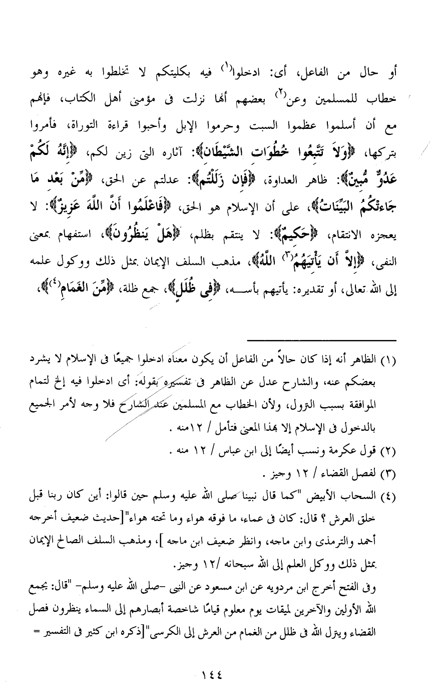 أو حال من الفاعل، أي: ادخلوا فيه بكليتكم لا تخلطوا به غيره وهو خطاب للمسلمين وعن بعضهم أنها نزلت في مؤمني أهل الكتاب، فإنهم [ما] (1) أن أسلموا عظموا السبت وحرموا الإبل وأحبوا قراءة التوراة، فأُمروا بتركها، (وَلَا تَتَّبِعُوا خُطُوَاتِ الشَّيْطَانِ): آثاره التي زين لكم، (إِنَّهُ لَكُمْ عَدُوٌّ مُبِينٌ): ظاهر العداوة، (فَإِن زَلَلْتُم): عدلتم عن الحق، (مِّنْ بَعْد مَا جَاءتْكُمُ البَيناتُ)، على أن الإسلام هو الحق، (فَاعْلَمُوا أَن الله عَزِيزٌ): لا يعجزه الانتقام، (حَكِيمٌ): لا ينتقم بظلم، (هَلْ يَنظُرُون)، استفهام بمعنى النفي، (إِلا أَن يَأتِيَهُمُ اللهُ)، مذهب السلف الإيمان بمثل ذلك ووكول علمه إلى الله تعالى، أو تقديره: يأتيهم بأسه، (فِي ظُلَلٍ)، جمِع ظلة، (مِنَ الْغَمَامِ)،