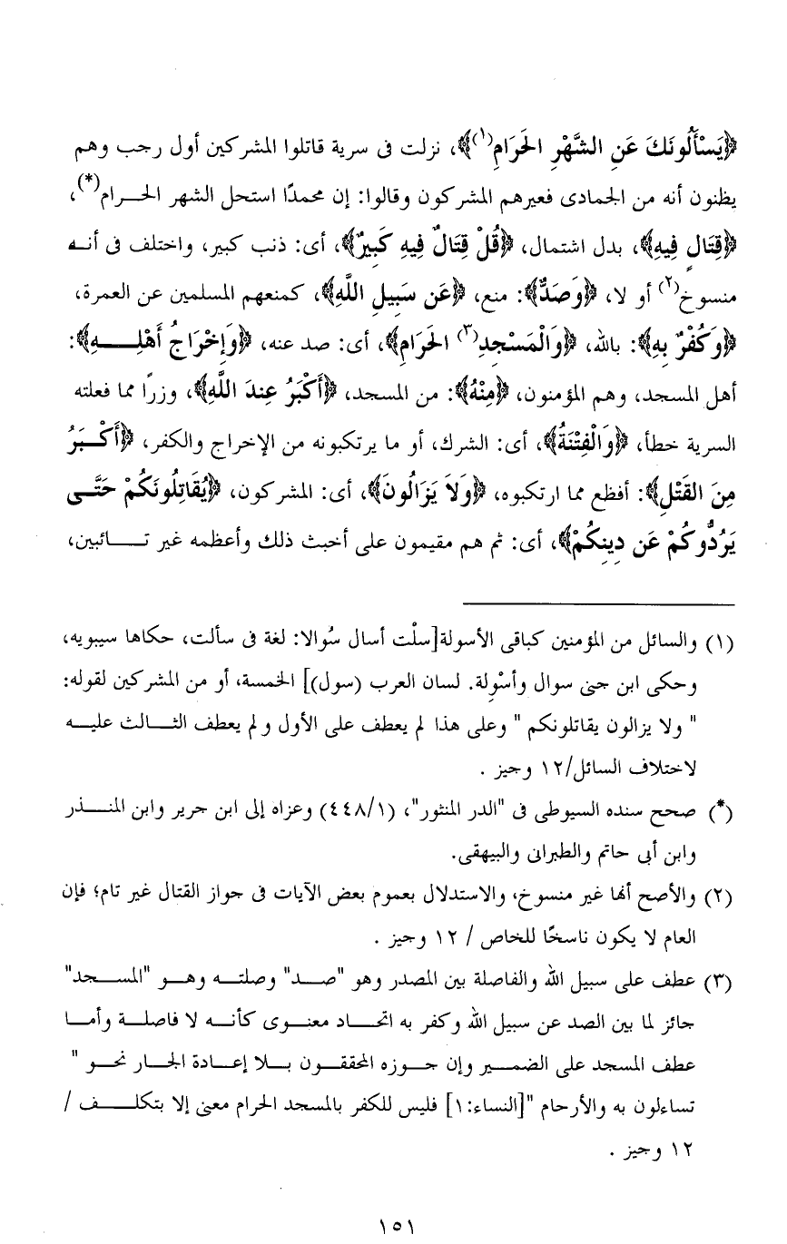 (يَسْأَلُونَكَ عَنِ الشَّهْرِ الْحَرَامِ)، نزلت في سرية قاتلوا المشركين أول رجب وهم يظنون أنه من الجمادى فعيرهم المشركون وقالوا: إن محمدًا استحل الشهر الحرام، (قِتَالٍ فِيهِ)، بدل اشتمال، (قُلْ قِتَالٌ فِيهِ كَبِيرٌ)، أي: ذنب كبير، واختلف في أنه منسوخ أو لا، (وَصَدٌّ): منع، (عَن سَبيلِ اللهِ)، كمنعهم المسلمين عن العمرة، (وَكُفْرٌ بِهِ): بالله، (وَالْمَسْجدِ الحَرَامِ)، أي: صد عنه، (وَإخْرَاجُ أَهْلِهِ): أهل المسجد، وهم المؤمنون، (منهُ): من المسجد، (أَكْبَرُ عِندَ اللهِ)، وزرًا مما فعلته السرية خطأً، (وَالْفِتْنَةُ)، أي: الشرك، أو ما يرتكبونه من الإخراج والكفر، (أَكبَرُ مِنَ القَتْلِ): أفظع مما ارتكبوه، (وَلاَ يَزَالُونَ)، أي: المشركون، (يُقَاتِلُونَكُمْ حَتَّى يَرُدوكُمْ عَن دِينِكُمْ)، أي: ثم هم مقيمون على أخبث ذلك وأعظمه غير تائبين،
