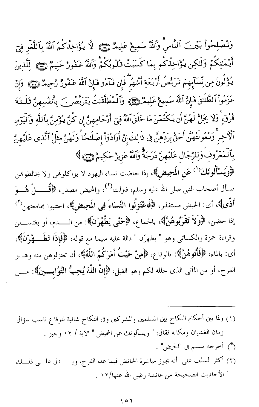 وَتُصْلِحُوا بَيْنَ النَّاسِ وَاللهُ سَمِيعٌ عَلِيمٌ (224) لَا يُؤَاخِذُكُمُ اللهُ بِاللَّغْوِ فِي أَيْمَانِكُمْ وَلَكِنْ يُؤَاخِذُكُمْ بِمَا كَسَبَتْ قُلُوبُكُمْ وَاللهُ غَفُورٌ حَلِيمٌ (225) لِلَّذِينَ يُؤْلُونَ مِنْ نِسَائِهِمْ تَرَبُّصُ أَرْبَعَةِ أَشْهُرٍ فَإِنْ فَاءُوا فَإِنَّ اللهَ غَفُورٌ رَحِيمٌ (226) وَإِنْ عَزَمُوا الطَّلَاقَ فَإِنَّ اللهَ سَمِيعٌ عَلِيمٌ (227) وَالْمُطَلَّقَاتُ يَتَرَبَّصْنَ بِأَنْفُسِهِنَّ ثَلَاثَةَ قُرُوءٍ وَلَا يَحِلُّ لَهُنَّ أَنْ يَكْتُمْنَ مَا خَلَقَ اللهُ فِي أَرْحَامِهِنَّ إِنْ كُنَّ يُؤْمِنَّ بِاللهِ وَالْيَوْمِ الْآخِرِ وَبُعُولَتُهُنَّ أَحَقُّ بِرَدِّهِنَّ فِي ذَلِكَ إِنْ أَرَادُوا إِصْلَاحًا وَلَهُنَّ مِثْلُ الَّذِي عَلَيْهِنَّ بِالْمَعْرُوفِ وَلِلرِّجَالِ عَلَيْهِنَّ دَرَجَةٌ وَاللهُ عَزِيزٌ حَكِيمٌ (228)