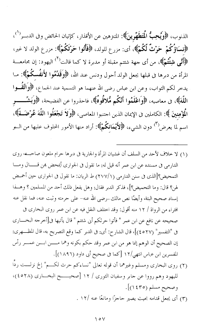 الذنوب، (وَيُحِبُّ الْمُتَطَهِّرِينَ): المتنزهين عن الأقذار، كإتيان الحائض وفي الدبر، (نسَاؤُكُمْ حَرْثٌ لكمْ)، أي: مزرع للولد، (فَأْتُوا حَرْثَكُمْ): مزرع الولد لا غير، (أَنَّى شِئْتُمْ)، من أي جهة شئتم مقبلة أو مدبرة لا كما قالت اليهود: إن مجامعة المرأة من دبرها في قبلها يجعل الولد أحول ودنس عند الله، (وَقَدِّمُوا لأَنفُسكُم): ما يدخر لكم الثواب، وعن ابن عباس رضى الله عنهما هو التسمية عند الجماع، (وَاتَّقُوا الله)، في معاصيه، (وَاعْلَموا أَنَّكُم مُّلاقُوهُ)، فاحذروا عن الفضيحة، (وَبَشِّر الْمُؤْمِنِينَ): الكاملين في الإيمان الذين اجتنبوا المعاصي، (وَلاَ تَجْعَلُوا الله عُرْضَةً)، اسم لما يعرض دون الشيء، (لأَيْمَانِكُم): أراد منها الأمور المحلوف عليها من البر