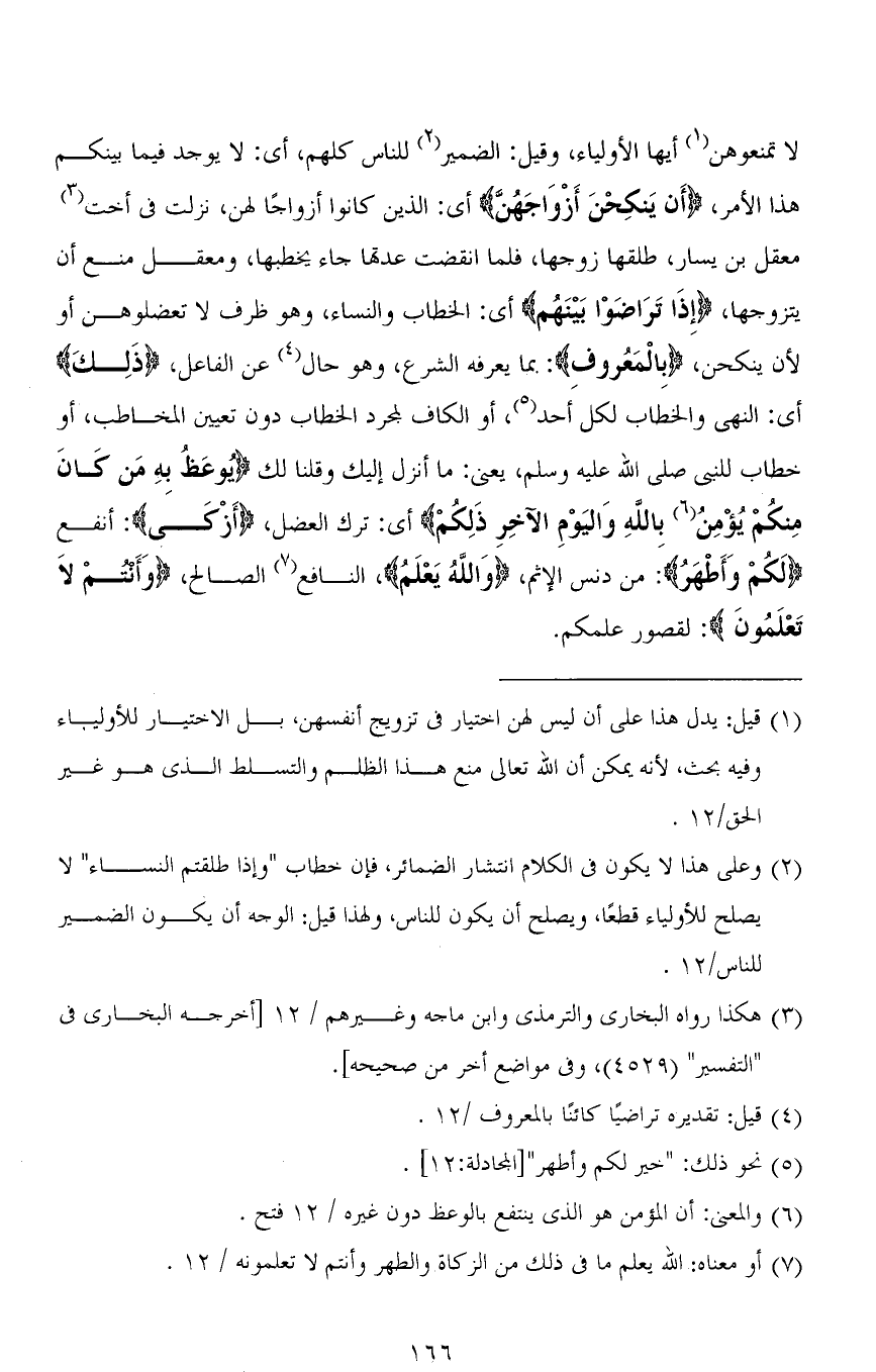 لا تمنعوهن أيها الأولياء، وقيل: الضمير للناس كلهم، أي: لا يوجد فيما بينكم هذا الأمر، (أَنْ يَنكِحْنَ أَزْوَاجَهُنَّ) أي: الذين كانوا أزواجًا لهن، نزلت في أخت معقل بن يسار، طلقها زوجها، فلما انقضت عدتها جاء يخطبها، ومعقل منع أن يتزوجها، (إِذَا تَرَاضَوْا بَيْنَهُمْ) أي: الخطاب والنساء، وهو ظرف لا تعضلوهن أو لأن ينكحن، (بِالْمَعُروف): بما يعرفه الشرع، وهو حال عن الفاعل، (ذلِكَ) أى: النهي والخطاب لكل أَحد، أو الكاف لمجرد الخطاب دون تعيين المخاطب، أو خطاب للنبي صلى الله عليه وسلم، يعني: ما أنزل إليك وقلنا لك (يُوعَظُ بِهِ مَنْ كَانَ مِنْكُمْ يُؤْمِنُ بِاللهِ وَالْيَوْمِ الْآخِرِ ذَلِكُمْ) أي: ترك العضل، (أَزْكى): أنفع (لَكُمْ وَأَطْهَرُ). من دنس الإثم، (وَاللهُ يَعْلَمُ)، النافع الصالح، (وَأَنتمْ لاَ تَعْلَمونَ): لقصور علمكم.