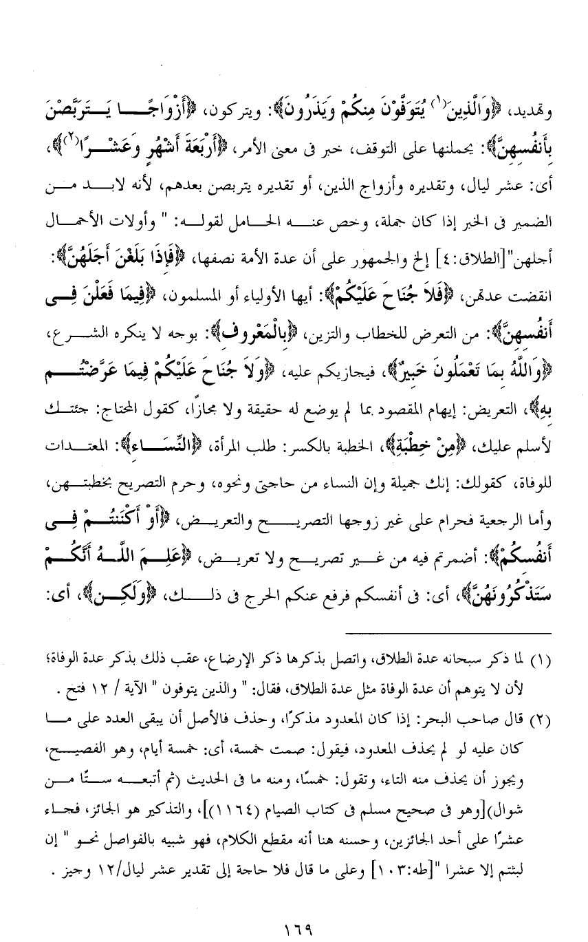 وتهديد، (وَالَّذِينَ يُتَوَفوْنَ مِنكُمْ وَيَذَرُونَ): ويتركون، (أَزْوَاجًا يَتَرَبَّصْنَ بِأَنفُسِهِنَّ): يحملنها على التوقف، خبر في معنى الأمر، (أَرْبَعَةَ أَشهُرٍ وَعَشْرًا)، أى: عشر ليال، وتقديره وأزواج الذين، أو تقديره يتربصن بعدهم، لأنه لابد من الضمير في الخبر إذا كان جملة، وخص عنه الحامل لقوله: " وأولات الأحمال أجلهن " [الطلاق: 4] إلخ، والجمهور على أن عدة الأمة نصفها، (فَإِذَا بَلَغْنَ أَجَلَهُنَّ): انقضت عدتهن، (فَلاَ جُنَاحَ عَلَيْكمْ): أيها الأولياء أو المسلمون، (فِيمَا فَعَلْنَ فِي أَنْفُسِهِنَّ): من التعرض للخطاب والتزين، (بِالْمَعْروفِ): بوجه لا ينكره الشرع، (وَاللهُ بِمَا تَعْمَلُونَ خَبِير)، فيجازيكم عليه، (وَلَا جُنَاحَ عَلَيْكُمْ فِيمَا عَرَّضْتُمْ بِهِ)، التعريض: إيهام المقصود بما لم يوضع له حقيقة ولا مجازًا، كقول المحتاج: جئتك لأسلم عليك، (مِنْ خِطْبَةِ)، الخطبة بالكسر: طلب المرأة، (النِّسَاءِ): المعتدات للوفاة، كقولك: إنك جميلة وإن النساء من حاجتي ونحوه، وحرم التصريح بخطبتهن، وأما الرجعية فحرام على غير زوجها التصريح والتعريض، (أَوْ أَكْنَنْتُمْ فِي أَنْفُسِكُمْ): أضمرتم فيه من غير تصريح ولا تعريض، (عَلِمَ اللهُ أَنَّكُمْ سَتَذْكُرُونَهُنَّ)، أي: في أنفسكم فرفع عنكم الحرج في ذلك، (وَلَكِن)، أي:
