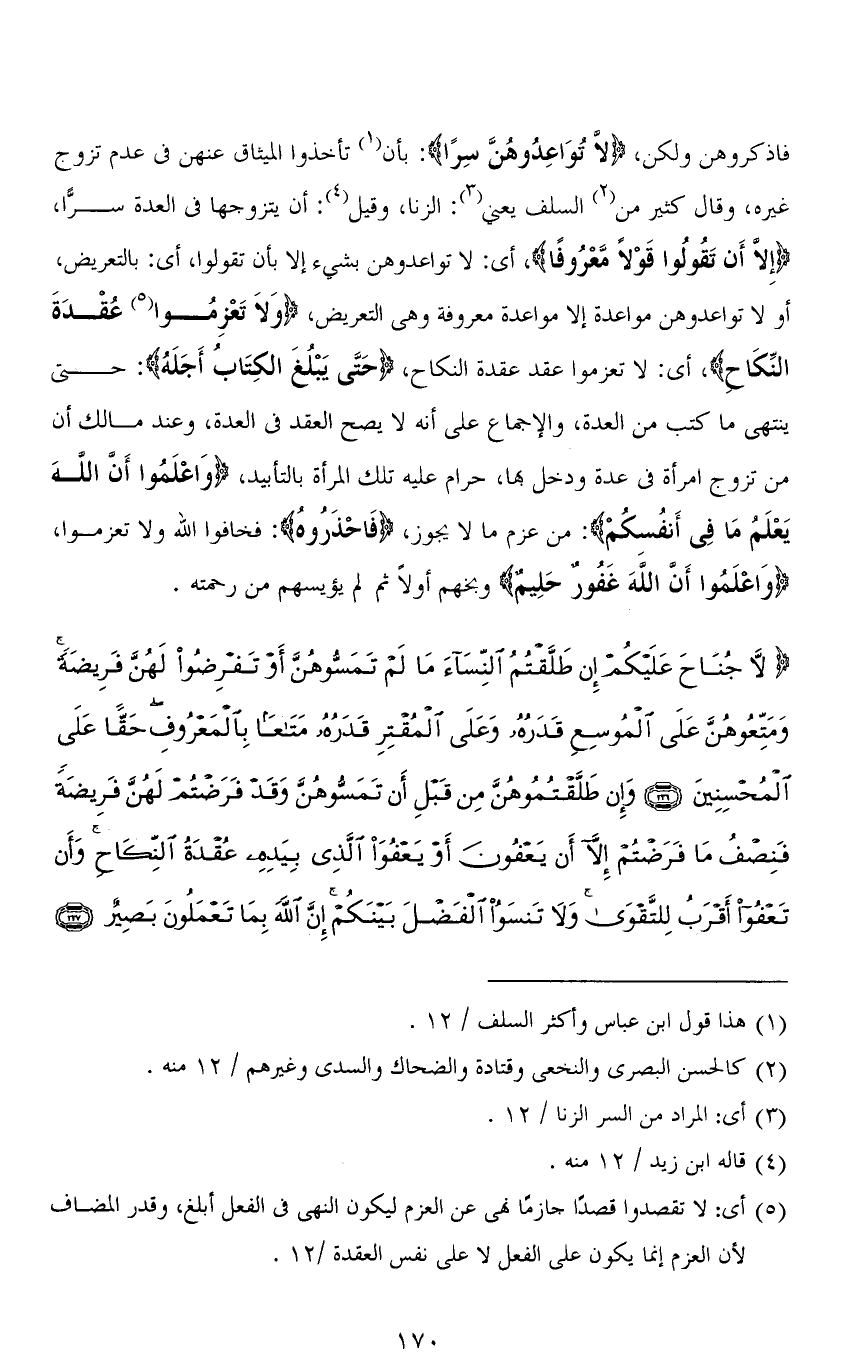 فاذكروهن ولكن، (لاَّ تُوَاعِدُوهُنَّ سِرًا): بأن تأخذوا الميثاق عنهن في عدم تزوج غيره، وقال كثير من السلف يعني: الزنا، وقيل: أن يتزوجها في العدة سرًّا، (إِلا أَن تَقُولُوا قَوْلاً مَّعْرُوفًا)، أي: لا تواعدوهن بشيء إلا بأن تقولوا، أي: بالتعريض، أو لا تواعدوهن مواعدة إلا مواعدة معروفة وهي التعريض، (وَلاَ تَعْزِمُوا عُقْدَةَ النكَاحِ)، أي: لا تعزموا عقد عقدة النكاح، (حَتَّى يَبْلغَ الكتابُ أَجَلَهُ): حتى ينتهى ما كتب من العدة، والإجماع على أنه لا يصح العقد في العدة، وعند مالك أن من تزوج امرأة في عدة ودخل بها، حرام عليه تلك المرأة بالتأبيد، (وَاعْلَمُوا أَن اللهَ يَعْلَمُ مَا في أَنفُسكُمْ): من عزم ما لا يجوز، (فَاحْذَرُوهُ): فخافوا الله ولا تعزموا، (وَاعْلَمُوا أَن الله غَفُورٌ حَلِيمٌ) وبخهم أولاً ثم لم يؤيسهم من رحمته.
