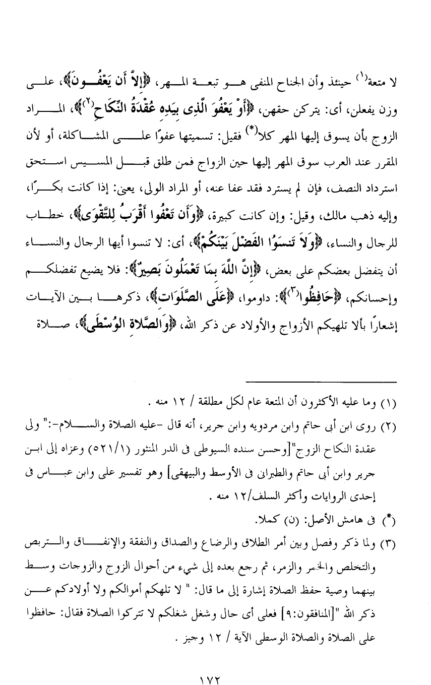 لا متعة حينئذ وأن الجناح المنفى هو تبعة الهر، (إِلَّا أَنْ يَعْفُونَ)، على وزن يفعلن، أي: يتركن حقهن، (أَوْ يَعْفُوَ الَّذِي بِيَدِهِ عُقْدَةُ النِّكَاحِ)، المراد الزوج بأن يسوق إليها المهر كلا فقيل: تسميتها عفوًا على المشاكلة، أو لأن المقرر عند العرب سوق المهر إليها حين الزواج فمن طلق قبل المسيس استحق استرداد النصف، فإن لم يسترد فقد عفا عنه، أو المراد الولي، يعني: إذا كانت بكرًا، وإليه ذهب مالك، وقيل: وإن كانت كبيرة، (وَأَنْ تَعْفُوا أَقْرَبُ لِلتَّقْوَى)، خطاب للرجال والنساء، (وَلاَ تَنسَوُا الفَضْلَ بَيْنَكُمْ)، أي: لا تنسوا أيها الرجال والنساء أن يتفضل بعضكم على بعض، (إِنَّ اللهَ بِمَا تَعْمَلُونَ بَصِيرٌ): فلا يضيع تفضلكم وإحسانكم، (حَافِظُوا): داوموا، (عَلَى الصَّلَوَاتِ)، ذكرها بين الآيات إشعارًا بألا تلهيكم الأزواج والأولاد عن ذكر الله، (وَالصَّلاةِ الوُسْطَى)، صلاة
