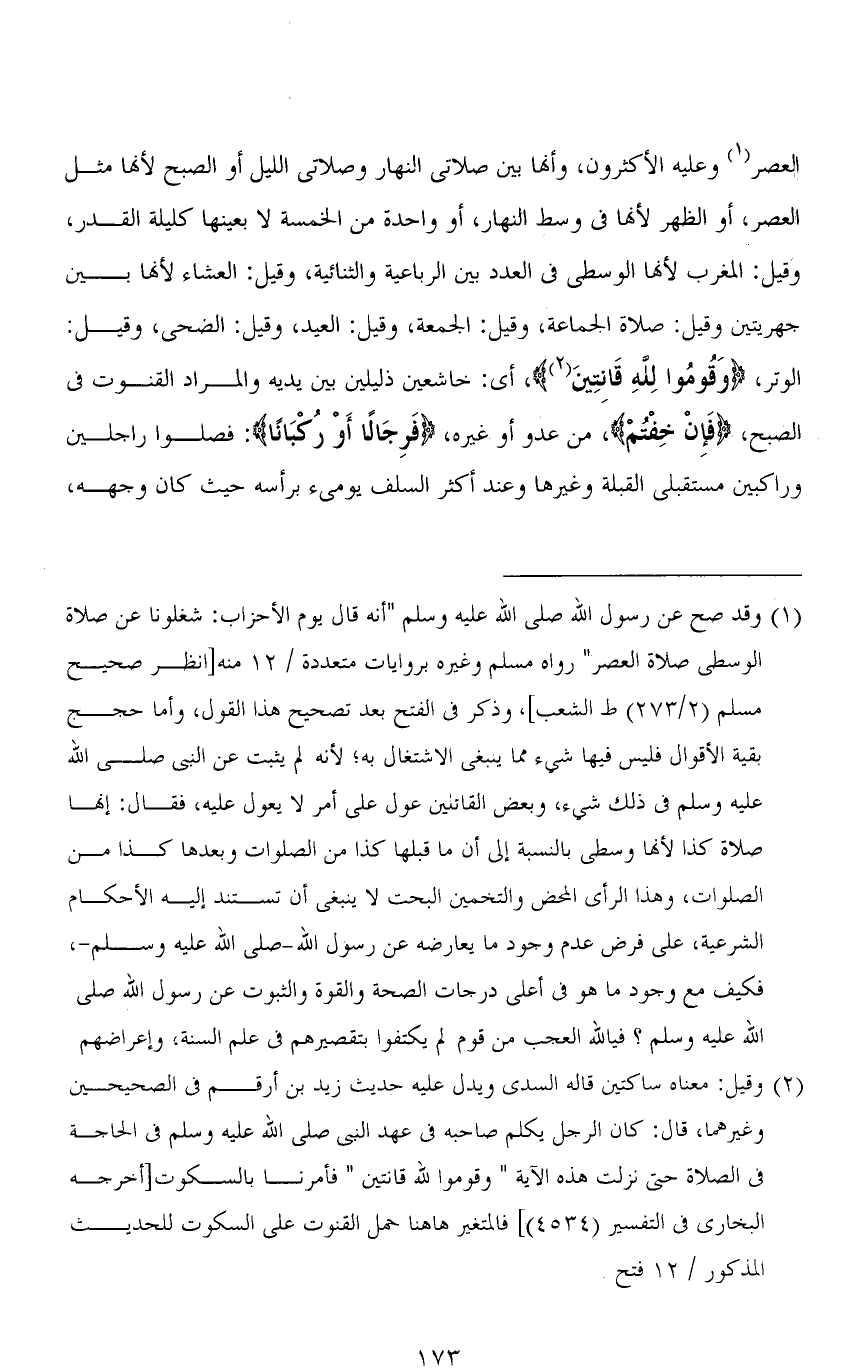 العصر وعليه الأكثرون، وأنَّهَا بين صلاتي النهار وصلاتي الليل أو الصبح لأنها مثل العصر، أو الظهر لأنها في وسط النهار، أو واحدة من الخمسة لا بعينها كليلة القدر، وقيل: المغرب لأنها الوسطى في العدد بين الرباعية والثنائية، وقيل: العشاء لأنها بين جهريتين وقيل: صلاة الجماعة، وقيل: الجمعة، وقيل: العيد، وقيل: الضحى، وقيل: الوتر، (وَقُومُوا لِلَّهِ قَانِتِينَ)، أي: خاشعين ذليلين بين يديه والمراد القنوت في الصبح، (فَإِنْ خِفْتُمْ)، من عدو أو غيره، (فَرِجَالًا أَوْ رُكْبَانًا): فصلوا راجلين وراكبين مستقبلي القبلة وغيرها وعند أكثر السلف يومئ برأسه حيث كان وجهه،