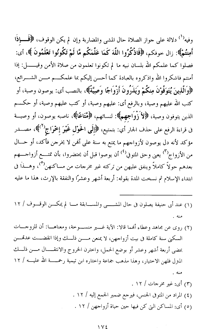 وفيه دلالة على جواز الصلاة حال المشى والمضاربة وإن لم يكن الوقوف، (فَإِذَا أَمِنْتُمْ): زال خوفكم، (فَاذْكُرُوا اللهَ كَمَا عَلَّمَكُمْ مَا لَمْ تَكُونُوا تَعْلَمُونَ)، أي: فصلوا كما علمكم الله بلسان نبيه ما لم تكونوا تعلمون من صلاة الأمن وقيل: إذا أمنتم فاشكروا الله واذكروه بالعبادة كما أحسن إليكم بما علمكم من الشرائع، (وَالَّذِينَ يُتَوَفوْنَ مِنكُمْ وَيَذَرُونَ أَزْوَاجًا وَصِيَّةً)، بالنصب أي: يوصون وصية، أو كتب الله عليهم وصية، وبالرفع أي: عليهم وصية، أو كتب عليهم وصية، أو حكم الذين يُتوفون وصية، (لأَزْوَاجِهِم): لنسائهم، (مَّتَاعًا)، ناصبه يوصون، أو وصية في قراءة الرفع على حذف الجار أي: بتمتيع، (إِلَى الحَوْلِ عيْرَ إِخرَاج)، مصدر مؤكد لأنه دل يوصون لأزواجهم ما يمتع به سنة على أنهن لا يخرجن فأكد، أو حال من الأزواج يعني وحق المتوفي أن يوصوا قبل أن يحتضروا، بأن تمتع أزواجهم بعدهم حولاً كاملا وينفق عليهن من تركته غير مخرجات من مساكنهن، وهذا في ابتداء الإسلام ثم نسخت المدة بقوله: (أربعة أشهر وعشرًا) والنفقة بالإرث، هذا ما عليه