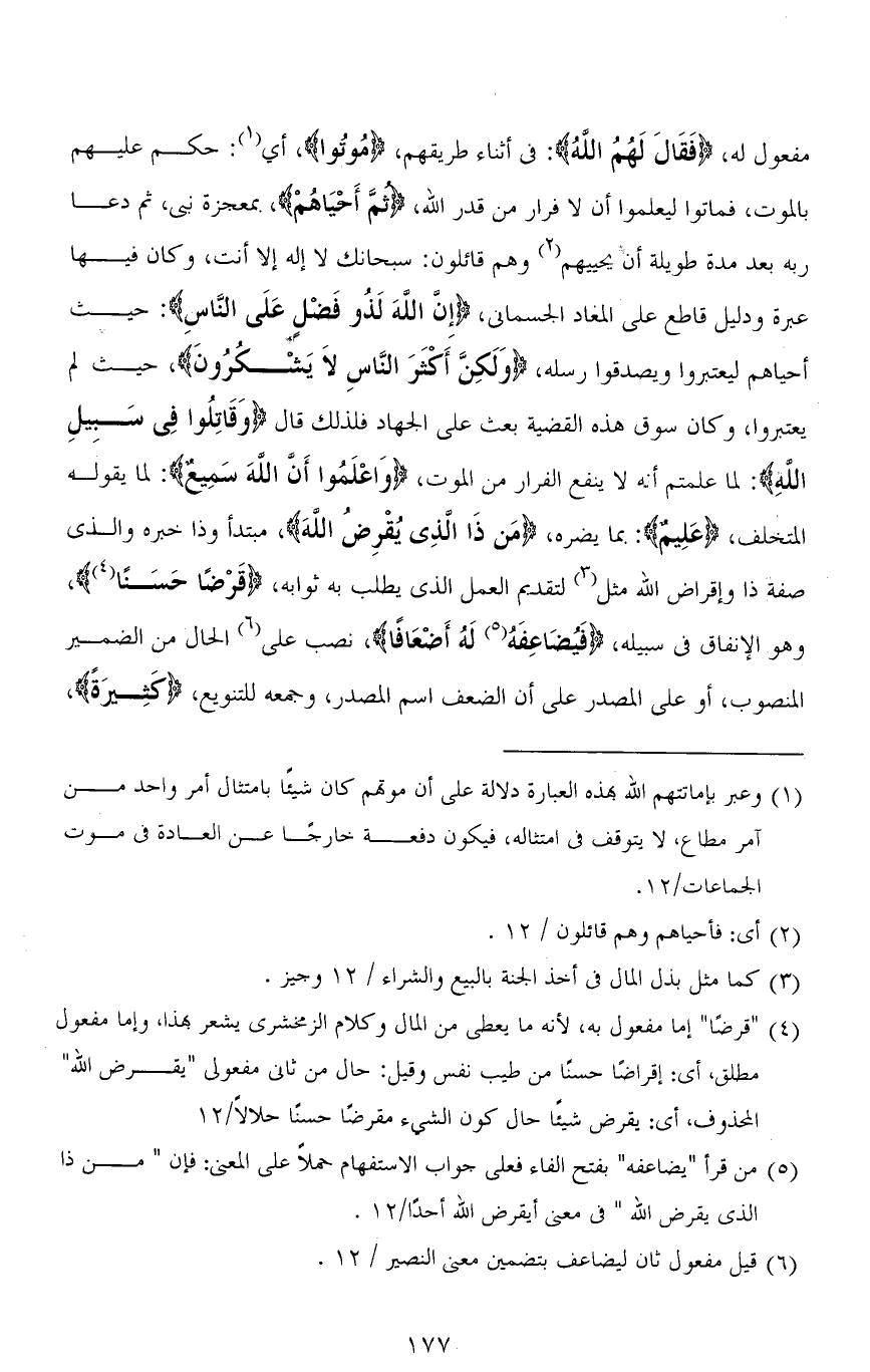مفعول له، (فَقَالَ لَهُمُ اللهُ): في أثناء طريقهم، (مُوتُوا)، أي: حكم عليهم بالموت، فماتوا ليعلموا أن لا فرار من قدر الله، (ثُمَّ أَحْيَاهُمْ)، بمعجزة نبي، ثم دعا ربه بعد مدة طويلة أن يحييهم وهم قائلون: سبحانك لا إله إلا أنت، وكان فيها عبرة ودليل قاطع على المعاد الجسماني، (إِنَّ اللهَ لَذُو فضل عَلَى النَّاسِ): حيث أحياهم ليعتبروا ويصدقوا رسله، (وَلَكِنَّ أَكْثَرَ النَّاسِ لَا يَشْكُرُونَ)، حيث لم يعتبروا، وكان سوق هذه القضية بعث على الجهاد فلذلك قال (وَقَاتِلُوا في سَبِيلِ الله): لما علمتم أنه لا ينفع الفرار من الموت، (وَاعْلَمُوا أَنَّ اللهَ سَمِيعٌ): لما يقوله المتخلف، (عَلِيمٌ): بما يضره، (مَن ذَا الذِي يُقْرِضُ الله)، مبتدأ وذا خبره والذي صفة ذا وإقراض الله مثل لتقديم العمل الذي يطلب به ثوابه، (قَرْضًا حَسَنًا)، وهو الإنفاق في سبيله، (فيُضَاعِفَهُ لَهُ أَضْعَافًا)، نصب على الحال من الضمير المنصوب، أو على المصدر على أن الضعف اسم المصدر، وجمعه للتنويع، (كَثيرَةً)،