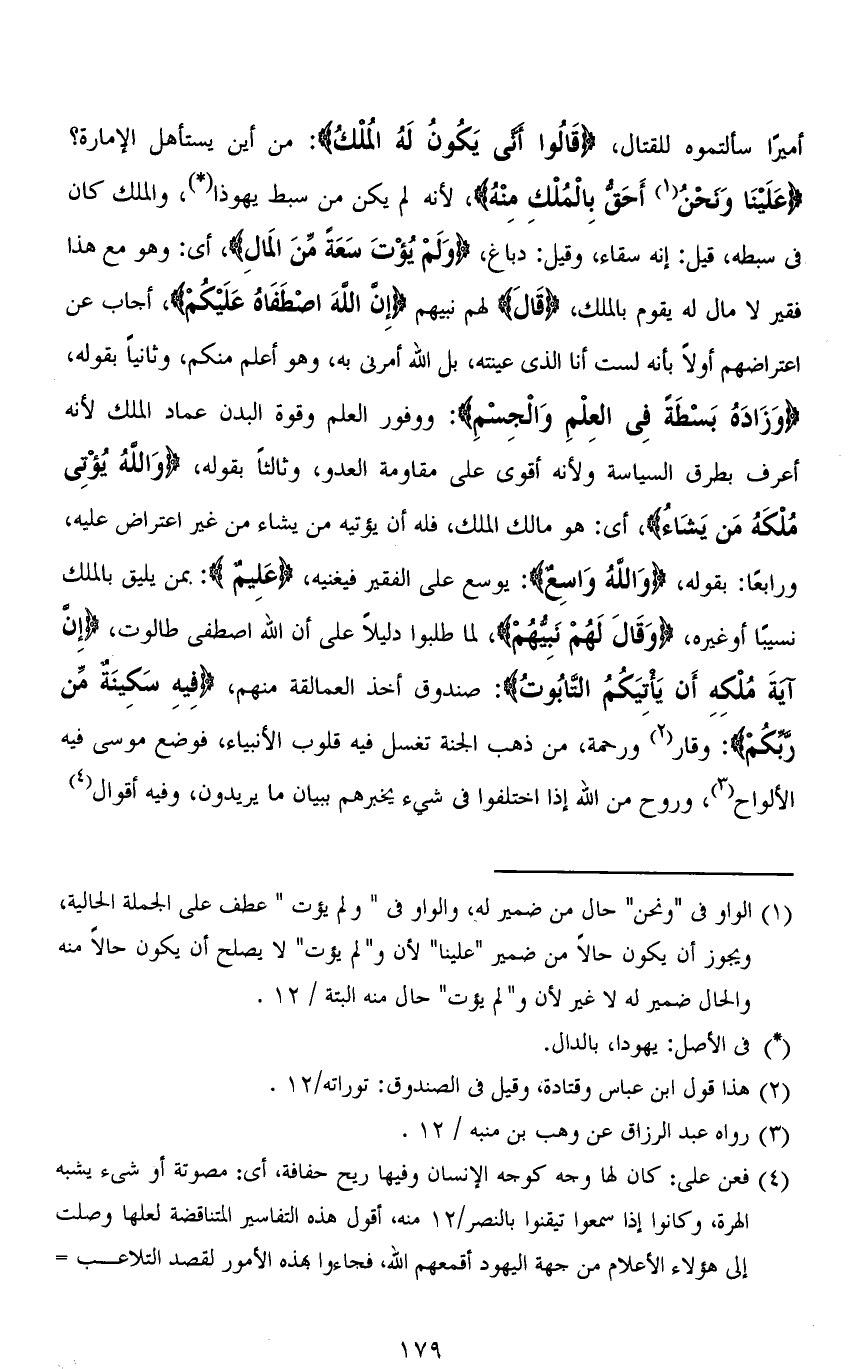 أميرًا سألتموه للقتال، (قَالُوا أَنَّى يَكُونُ لَهُ الْمُلْكُ): من أين يستأهل الإمارة؟ (عَلَيْنَا وَنحْنُ أَحَقُّ بِالْمُلْكِ مِنْهُ)، لأنه لم يكن من سبط يهوذا، والملك كان فى سبطه، قيل: إنه سقاء، وقيل: دباغ، (وَلَمْ يُؤْتَ سَعَةً مِّنَ المالِ)، أي: وهو مع هذا فقير لا مال له يقوم بالملك، (قَالَ) لهم نبيهم (إِنَّ اللهَ اصْطَفَاهُ عَلَيْكُمْ)، أجاب عن اعتراضهم أولاً بأنه لست أنا الذي عينته، بل الله أمرني به، وهو أعلم منكم، وثانيًا بقوله، (وَزَادَهُ بَسْطَةً فِي العِلْمِ وَالْجِسْمِ): ووفور العلم وقوة البدن عماد الملك لأنه أعرف بطرق السياسة ولأنه أقوى على مقاومة العدو، وثالثًا بقوله، (وَاللهُ يُؤْتِي مُلْكَهُ مَن يَشَاءُ)، أي: هو مالك الملك، فله أن يؤتيه من يشاء من غير اعتراض عليه، ورابعًا: بقوله، (وَاللهُ وَاسِعٌ): يوسع على الفقير فيغنيه، (عَلِيمٌ):. بمن يليق بالملك نسيبًا أو غيره، (وَقَالَ لَهُمْ نَبِيُّهُمْ)، لما طلبوا دليلاً على أن الله اصطفى طالوت، (إِنَّ آيَةَ مُلْكِهِ أَنْ يَأْتِيَكُمُ التَّابُوتُ): صندوق أخذ العمالقة منهم، (فِيهِ سَكِينَةٌ من ربكُمْ) وقار ورحمة، من ذهب الجنة تغسل فيه قلوب الأنبياء، فوضع موسى فيه الألواح، وروح من الله إذا اختلفوا في شيء يخبرهم ببيان ما يريدون، وفيه أقوال
