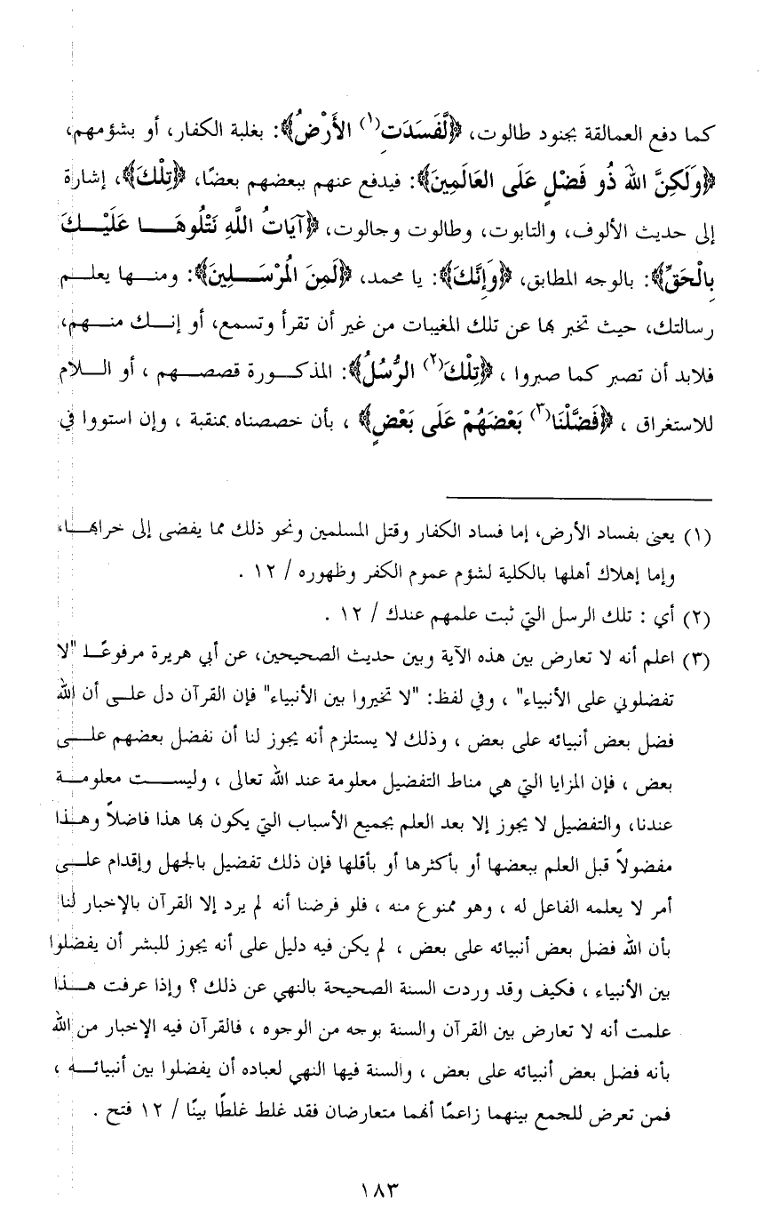 كما دفع العمالقة بجنود طالوت، (لَفَسَدَتِ الْأَرْضُ): بغلبة الكفار، أو بشؤمهم، (وَلَكِنَّ اللهَ ذُو فَضْلٍ عَلَى الْعَالَمِينَ): فيدفع عنهم ببعضهم بعضًا، (تِلْكَ)، إشارة إلى حديث الألوف، والتابوت، وطالوت وجالوت، (آيَاتُ اللهِ نَتْلُوهَا عَلَيْكَ بِالْحَقِّ): بالوجه المطابق، (وَإِنَّكَ): يا محمد، (لَمِنَ الْمُرْسَلِينَ): ومنها يعلم رسالتك، حيث تخبر بها عن تلك المغيبات من غير أن تقرأ وتسمع، أو إنك منهم، فلابد أن تصبر كما صبروا، (تِلْكَ الرُّسُلُ): المذكورة قصصهم، أو اللام للاستغراق، (فَضَّلْنَا بَعْضَهُمْ عَلَى بَعْضٍ)، بأن خصصناه بمنقبة، وإن استووا في