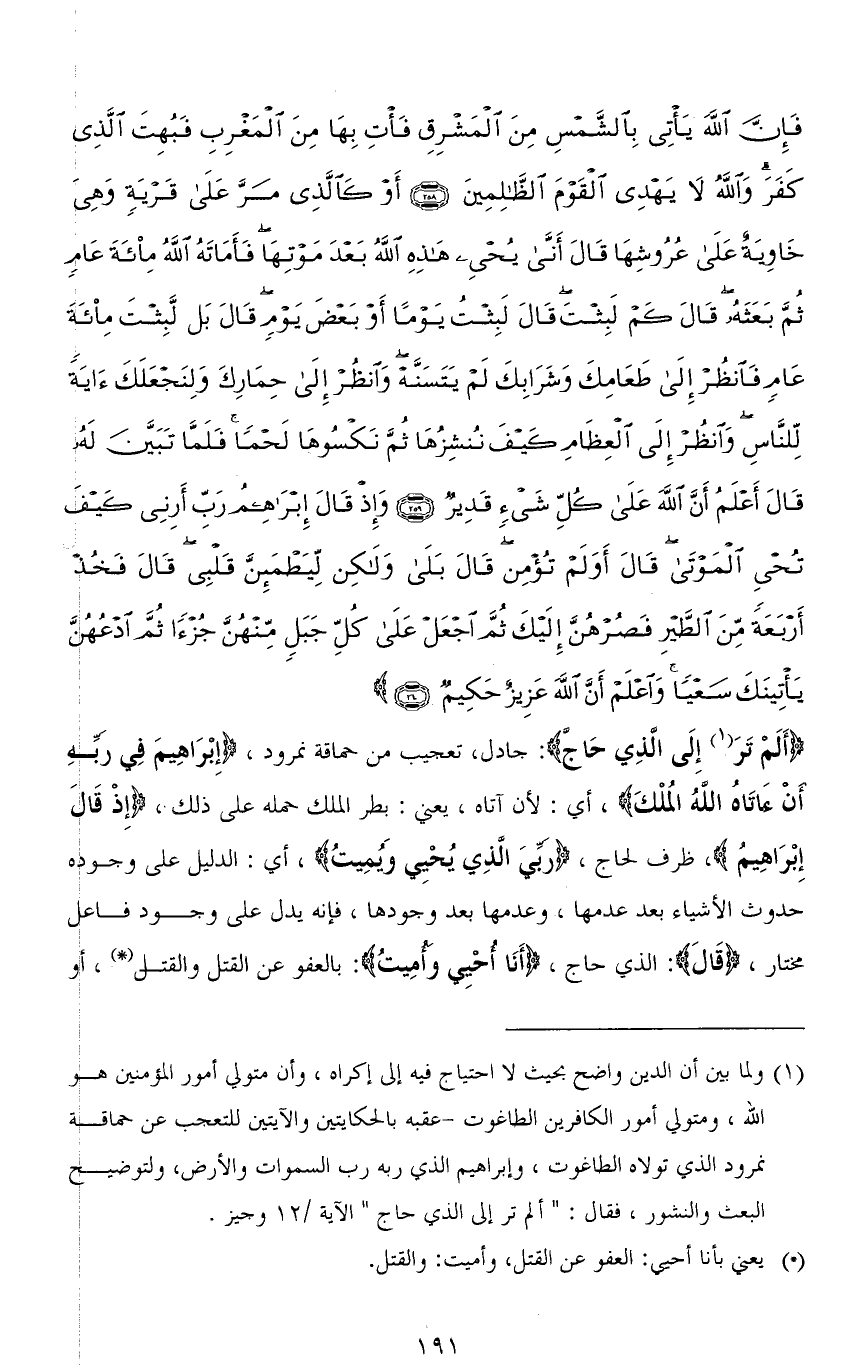 فَإِنَّ اللهَ يَأْتِي بِالشَّمْسِ مِنَ الْمَشْرِقِ فَأْتِ بِهَا مِنَ الْمَغْرِبِ فَبُهِتَ الَّذِي كَفَرَ وَاللهُ لَا يَهْدِي الْقَوْمَ الظَّالِمِينَ (258) أَوْ كَالَّذِي مَرَّ عَلَى قَرْيَةٍ وَهِيَ خَاوِيَةٌ عَلَى عُرُوشِهَا قَالَ أَنَّى يُحْيِي هَذِهِ اللهُ بَعْدَ مَوْتِهَا فَأَمَاتَهُ اللهُ مِائَةَ عَامٍ ثُمَّ بَعَثَهُ قَالَ كَمْ لَبِثْتَ قَالَ لَبِثْتُ يَوْمًا أَوْ بَعْضَ يَوْمٍ قَالَ بَلْ لَبِثْتَ مِائَةَ عَامٍ فَانْظُرْ إِلَى طَعَامِكَ وَشَرَابِكَ لَمْ يَتَسَنَّهْ وَانْظُرْ إِلَى حِمَارِكَ وَلِنَجْعَلَكَ آيَةً لِلنَّاسِ وَانْظُرْ إِلَى الْعِظَامِ كَيْفَ نُنْشِزُهَا ثُمَّ نَكْسُوهَا لَحْمًا فَلَمَّا تَبَيَّنَ لَهُ قَالَ أَعْلَمُ أَنَّ اللهَ عَلَى كُلِّ شَيْءٍ قَدِيرٌ (259) وَإِذْ قَالَ إِبْرَاهِيمُ رَبِّ أَرِنِي كَيْفَ تُحْيِ الْمَوْتَى قَالَ أَوَلَمْ تُؤْمِنْ قَالَ بَلَى وَلَكِنْ لِيَطْمَئِنَّ قَلْبِي قَالَ فَخُذْ أَرْبَعَةً مِنَ الطَّيْرِ فَصُرْهُنَّ إِلَيْكَ ثُمَّ اجْعَلْ عَلَى كُلِّ جَبَلٍ مِنْهُنَّ جُزْءًا ثُمَّ ادْعُهُنَّ يَأْتِينَكَ سَعْيًا وَاعْلَمْ أَنَّ اللهَ عَزِيزٌ حَكِيمٌ (260)