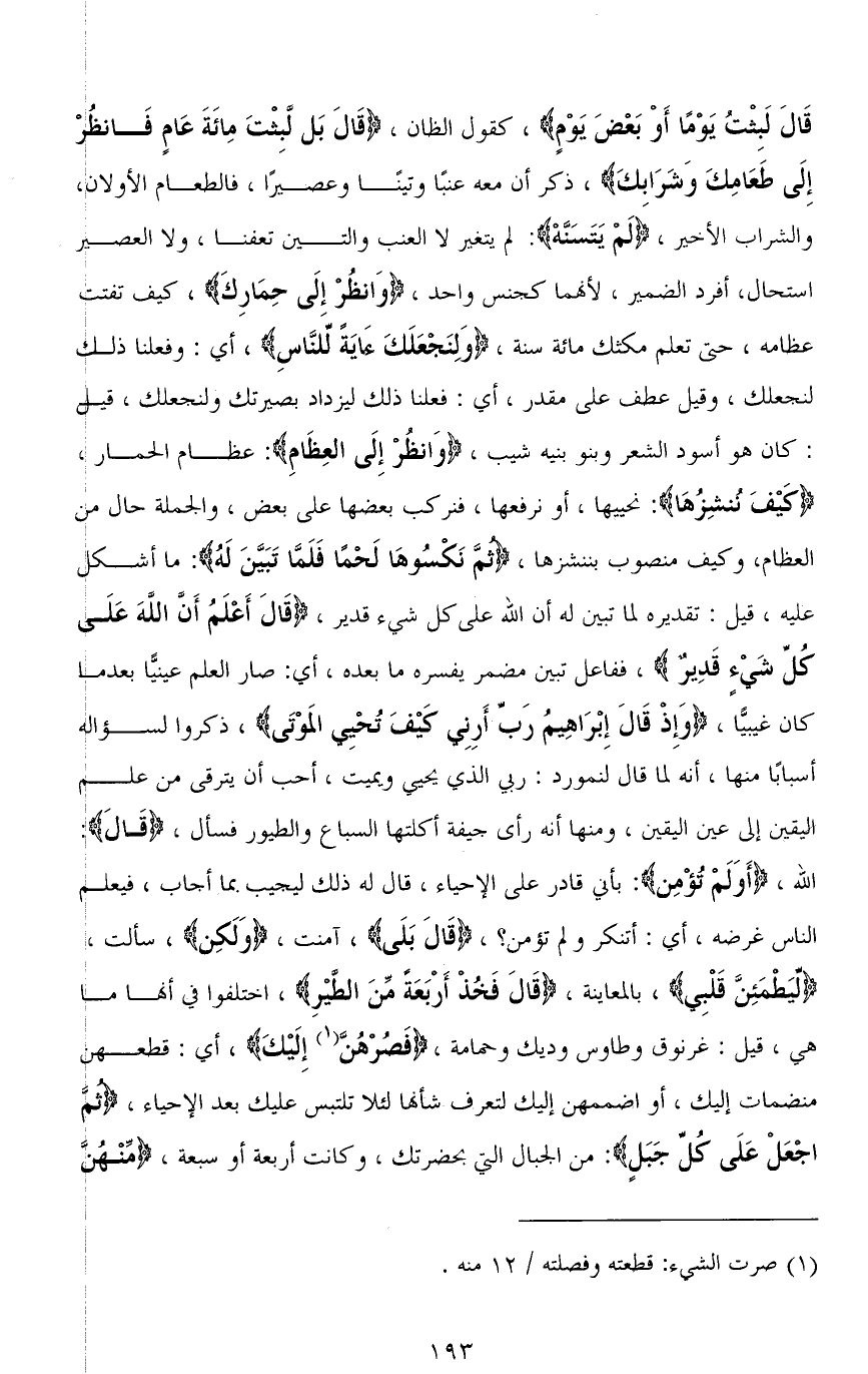 قَالَ لَبِثْتُ يَوْمًا أَوْ بَعْضَ يَوْمٍ)، كقول الظان، (قَالَ بَلْ لَبِثْتَ مِائَةَ عَامٍ فَانْظُرْ إِلَى طَعَامِكَ وَشَرَابِكَ)، ذُكر أن معه عنبًا وتينًا وعصيرا، فالطعام الأولان، والشراب الأخير، (لَمْ يَتَسَنَّهْ): لم يتغير لا العنب والتين تعفنا، ولا العصير استحال، أفرد الضمير، لأنهما كجنس واحد، (وَانظُرْ إلَى حِمَارِكَ)، كيف تفتت عظامه، حتى تعلم مكثك مائة سنة، (وَلِنَجْعَلَكَ آيَةً لِلنَّاسِ)، أي: وفعلنا ذلك لنجعلك، وقيل عطف على مقدر، أي: فعلنا ذلك ليزداد بصيرتك ولنجعلك، قيل: كان هو أسود الشعر وبنو بنيه شيب، (وَانظُرْ إِلَى العِظَامِ): عظام الحمار، (كَيْفَ نُنشِزُهَا): نحييها، أو نرفعها، فنركب بعضها على بعض، والجملة حال من العظام، وكيف منصوب بـ ننشزها، (ثُمَّ نَكْسُوهَا لَحْمًا فَلَمَّا تَبَيَّنَ لَهُ): ما أشكل عليه، قيل: تقديره لما تبين له أن الله على كل شيء قدير، (قَالَ أَعْلَمُ أَنَّ اللهَ عَلَى كُلِّ شَيْءٍ قَدِيرٌ)، ففاعل تبين مضمر يفسره ما بعده، أي: صار العلم عينيًّا بعدما كان غيبيًّا، (وَإِذْ قَالَ إِبْرَاهِيمُ رَبِّ أَرِنِي كَيْفَ تُحْيِ الْمَوْتَى)، ذكروا لسؤاله أسبابًا منها، أنه لما قال لنمورد: ربي الذي يحيي ويميت، أحب أن يترقى من علم اليقين إلى عين اليقين، ومنها أنه رأى جيفة أكلتها السباع والطيور فسأل، (قَالَ): الله، (أَوَلَمْ تُؤْمِن): بأني قادر على الإحياء، قال له ذلك ليجيب بما أجاب، فيعلم الناس غرضه، أي: أتنكر ولم تؤمن؟، (قالَ بَلَى)، آمنت، (وَلَكِن)، سألت، (ليَطْمَئِنَّ قلبي)، بالمعاينة، (قَالَ فَخُذْ أَرْبَعَةً مِنَ الطَّيْرِ)، اختلفوا في أنها ما هي، قيل: غرنوق وطاوس وديك وحمامة، (فَصُرْهُنَّ إِلَيْكَ)، أي: قطعهن منضمات إليك، أو اضممهن إليك لتعرف شأنها لئلا تلتبس عليك بعد الإحياء، (ثُمَّ اجْعَلْ عَلَى كُلِّ جَبَلٍ): من الجبال التي بحضرتك، وكانت أربعة أو سبعة، (مِنْهُنَّ