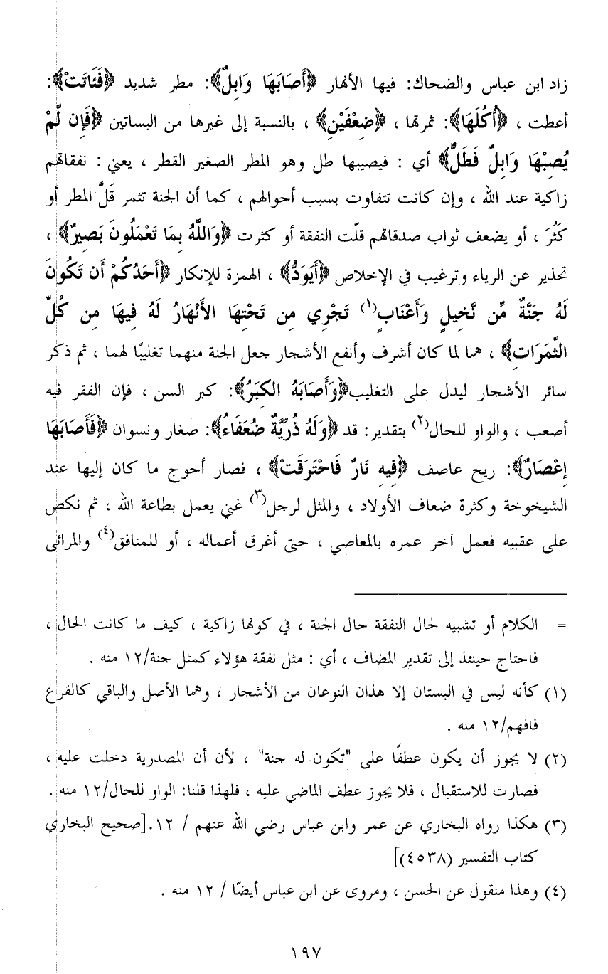 زاد ابن عباس والضحاك: فيها الأنهار (أَصَابَهَا وَابِلٌ): مطر شديد (فَئَاتَتْ): أعطت، (أُكُلَهَا): ثمرتها، (ضِعْفَيْنِ)، بالنسبة إلى غيرها من البساتين (فَإِنْ لَمْ يُصِبْهَا وَابِلٌ فَطَلٌّ) أي: فيصيبها طل وهو المطر الصغير القطر، يعني: نفقاتهم زاكية عند الله، وإن كانت تتفاوت بسبب أحوالهم، كما أن الجنة تثمر قَلَّ المطر أو كَثُرَ، أو يضعف ثواب صدقاتهم قلَّت النفقة أو كثرت (وَاللهُ بما تَعْمَلُونَ بَصِيرٌ)، تحذير عن الرياء وترغيب في الإخلاص (أَيَوَدُّ)، الهمزة للإنكارَ (أَحَدُكُمْ أَنْ تَكُونَ لَهُ جَنَّةٌ مِنْ نَخِيلٍ وَأَعْنَابٍ تَجْرِي مِنْ تَحْتِهَا الْأَنْهَارُ لَهُ فِيهَا مِنْ كُلِّ الثَّمَرَاتِ)، هما لما كان أشرف وأنفع الأشجار جعل الجنة منهما تغليبًا لهما، ثم ذكر سائر الأشجار ليدل على التغليب (وَأَصَابَهُ الْكِبَرُ): كبر السن، فإن الفقر فيه أصعب، والواو للحال بتقدير: قد (وَلَهُ ذُرِّيَّةٌ ضُعَفَاءُ): صغار ونسوان (فَأَصَابَهَا إِعْصَارٌ): ريح عاصف (فِيهِ نَارٌ فَاحْتَرَقَتْ)، فصار أحوج ما كان إليها عند الشيخوخة وكثرة ضعاف الأولاد، والمثل لرجل غني يعمل بطاعة الله، ثم نكص على عقبيه فعمل آخر عمره بالمعاصي، حتى أغرق أعماله، أو للمنافق والمرائي