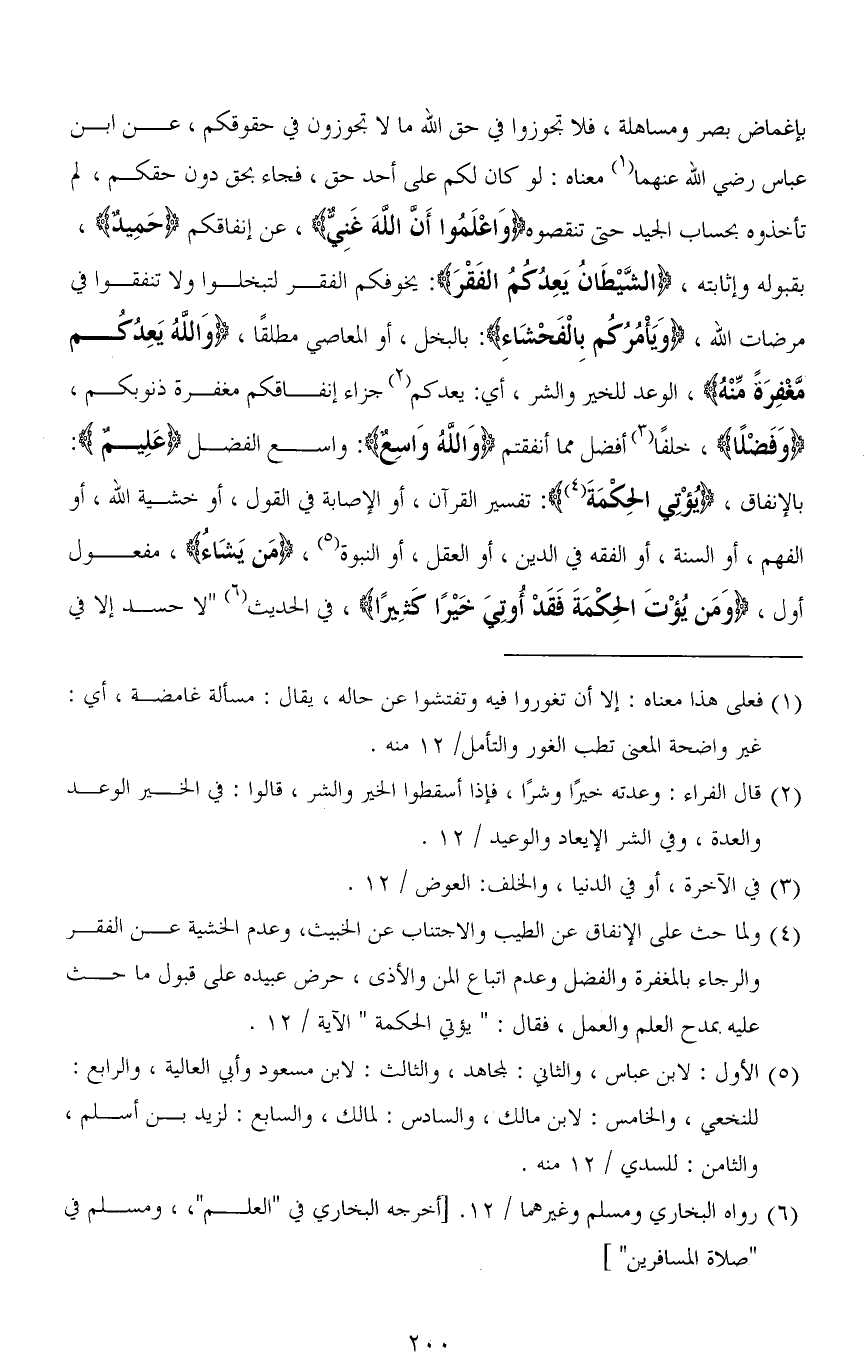 بإغماض بصر ومساهلة، فلا تجوزوا في حق الله ما لا تجوزون في حقوقكم، عن ابن عباس رضي الله عنهما معناه: لو كان لكم على أحد حق، فجاء بحق دون حقكم، لم تأخذوه بحساب الجيد حتى تنقصوه (وَاعْلَمُوا أَنَّ اللهَ غَنِيٌّ)، عن إنفاقكم (حَمِيدٌ)، بقبوده وإثابته، (الشَّيْطَانُ يَعِدُكُمُ الْفَقْرَ): يخوفكم الفقر لتبخلوا ولا تنفقوا في مرضات الله، (وَيَأْمُرُكُم بِالْفَحْشَاءِ): بالبخل، أو المعاصي مطلقًا، (وَاللهُ يَعِدُكُمْ مَغْفِرَةً مِنْهُ)، الوعد للخير والشر، أي: يعدكم جزاء إنفاقكم مغفرة ذنوبكم، (وَفَضْلًا)، خلفًا أفضل مما أنفقتم (وَاللهُ وَاسِعٌ): واسع الفضل (عَلِيمٌ): بالإنفاق، (يُؤْتِي الحِكْمَةَ): تفسير القرآن، أو الإصابة في القول، أو خشية الله، أو الفهم، أو السنة، أو الفقه في الدين، أو العقل، أو النبوة، (مَن يَشَاءُ)، مفعول أول، (وَمَنْ يُؤْتَ الْحِكْمَةَ فَقَدْ أُوتِيَ خَيْرًا كَثِيرًا)، فِي الحديث " لا حسد إلا في