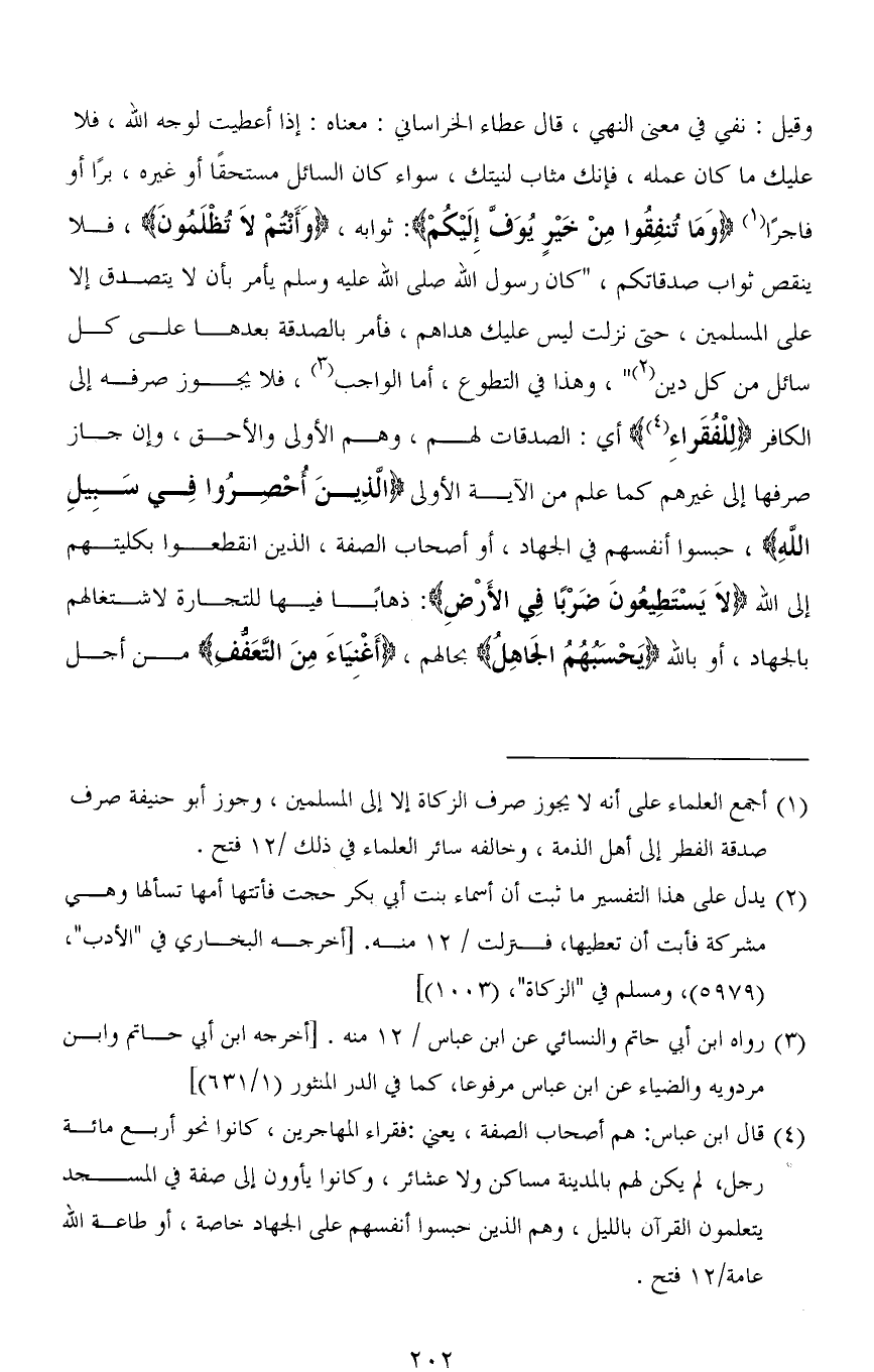 وقيل: نفي في معنى النهي، قال عطاء الخراساني: معناه: إذا أعطيت لوجه الله، فلا عليك ما كان عمله، فإنك مثاب لنيتك، سواء كان السائل مستحقًا أو غيره، برًا أو فاجرًا (وَمَا تُنفِقُوا مِنْ خَيْرٍ يُوَفَ إِلَيْكُمْ): ثوابه، (وَأَنتمْ لاَ تُظْلَمُونَ)، فلا ينقص ثواب صدقاتكم، " كان رسول الله صلى الله عليه وسلم يأمر بأن لا يتصدق إلا على المسلمين، حتى نزلت ليس عليك هداهم، فأمر بالصدقة بعدها على كل سائل من كل دين "، وهذا في التطوع، أما الواجب، فلا يجوز صرفه إلى الكافر (لِلْفُقَراءِ) أي: الصدقات لهم، وهم الأولى والأحق، وإن جاز صرفها إلى غيرهم كما علم من الآية الأولى (الَّذِينَ أُحْصِرُوا فِي سَبِيلِ اللهِ)، حبسوا أنفسهم في الجهاد، أو أصحاب الصفة، الذين انقطعوا بكليتهم إلى الله (لَا يَسْتَطِيعُونَ ضَرْبًا فِي الْأَرْضِ): ذهابًا فيها للتجارة لاشتغالهم بالجهاد، أو بالله (يَحْسَبُهُمُ الْجَاهِلُ) بحالهم، (أَغْنِيَاءَ مِنَ التَّعَفُّفِ) من أجل