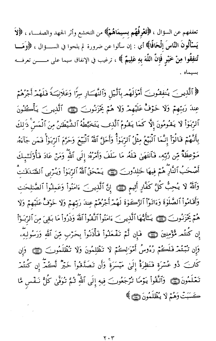 (الَّذِينَ يُنْفِقُونَ أَمْوَالَهُمْ بِاللَّيْلِ وَالنَّهَارِ سِرًّا وَعَلَانِيَةً فَلَهُمْ أَجْرُهُمْ عِنْدَ رَبِّهِمْ وَلَا خَوْفٌ عَلَيْهِمْ وَلَا هُمْ يَحْزَنُونَ (274) الَّذِينَ يَأْكُلُونَ الرِّبَا لَا يَقُومُونَ إِلَّا كَمَا يَقُومُ الَّذِي يَتَخَبَّطُهُ الشَّيْطَانُ مِنَ الْمَسِّ ذَلِكَ بِأَنَّهُمْ قَالُوا إِنَّمَا الْبَيْعُ مِثْلُ الرِّبَا وَأَحَلَّ اللهُ الْبَيْعَ وَحَرَّمَ الرِّبَا فَمَنْ جَاءَهُ مَوْعِظَةٌ مِنْ رَبِّهِ فَانْتَهَى فَلَهُ مَا سَلَفَ وَأَمْرُهُ إِلَى اللهِ وَمَنْ عَادَ فَأُولَئِكَ أَصْحَابُ النَّارِ هُمْ فِيهَا خَالِدُونَ (275) يَمْحَقُ اللهُ الرِّبَا وَيُرْبِي الصَّدَقَاتِ وَاللهُ لَا يُحِبُّ كُلَّ كَفَّارٍ أَثِيمٍ (276) إِنَّ الَّذِينَ آمَنُوا وَعَمِلُوا الصَّالِحَاتِ وَأَقَامُوا الصَّلَاةَ وَآتَوُا الزَّكَاةَ لَهُمْ أَجْرُهُمْ عِنْدَ رَبِّهِمْ وَلَا خَوْفٌ عَلَيْهِمْ وَلَا هُمْ يَحْزَنُونَ (277) يَا أَيُّهَا الَّذِينَ آمَنُوا اتَّقُوا اللهَ وَذَرُوا مَا بَقِيَ مِنَ الرِّبَا إِنْ كُنْتُمْ مُؤْمِنِينَ (278) فَإِنْ لَمْ تَفْعَلُوا فَأْذَنُوا بِحَرْبٍ مِنَ اللهِ وَرَسُولِهِ وَإِنْ تُبْتُمْ فَلَكُمْ رُءُوسُ أَمْوَالِكُمْ لَا تَظْلِمُونَ وَلَا تُظْلَمُونَ (279) وَإِنْ كَانَ ذُو عُسْرَةٍ فَنَظِرَةٌ إِلَى مَيْسَرَةٍ وَأَنْ تَصَدَّقُوا خَيْرٌ لَكُمْ إِنْ كُنْتُمْ تَعْلَمُونَ (280) وَاتَّقُوا يَوْمًا تُرْجَعُونَ فِيهِ إِلَى اللهِ ثُمَّ تُوَفَّى كُلُّ نَفْسٍ مَا كَسَبَتْ وَهُمْ لَا يُظْلَمُونَ (281)