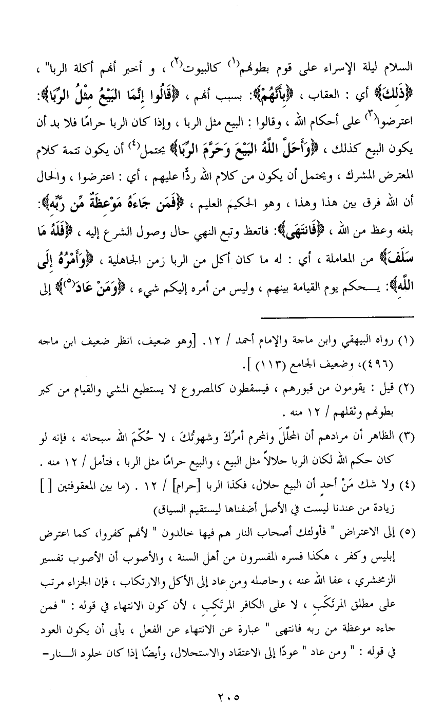 السلام ليلة الإسراء على قوم بطونهم كالبيوت، وأخبر أنَّهم أكلة الربا "، (ذَلِكَ) أي: العقاب، (بِأنهُمْ): بسبب أنَّهم، (قَالُوا إِنَّمَا الْبَيْعُ مِثْلُ الرِّبَا): اعترضوا على أحكام الله، وقالوا: البيع مثل الربا، وإذا كان الربا حرامًا فلا بد أن يكون البيع كذلك، (وَأَحَل اللهُ البَيْعَ وَحَرَّمَ الربا) يحتمل أن يكون تتمة كلام المعترض المشرك، ويحتمل أن يكون من كلام الله ردًّا عليهم، أي: اعترضوا، والحال أن الله فرق بين هذا وهذا، وهو الحكيم العليم، (فَمَنْ جَاءَهُ مَوْعِظَةٌ مِنْ رَبِّهِ): بلغه وعظ من الله، (فَانْتَهَى): فاتعظ وتبع النهي حال وصول الشرع إليه، (فَلَهُ مَا سَلَفَ) من المعاملة، أي: له ما كان أكل من الربا زمن الجاهلية، (وَأَمْرُهُ إِلَى اللهِ): يحكم يوم القيامة بينهم، وليس من أمره إليكم شيء، (وَمَنْ عَادَ) إلى
