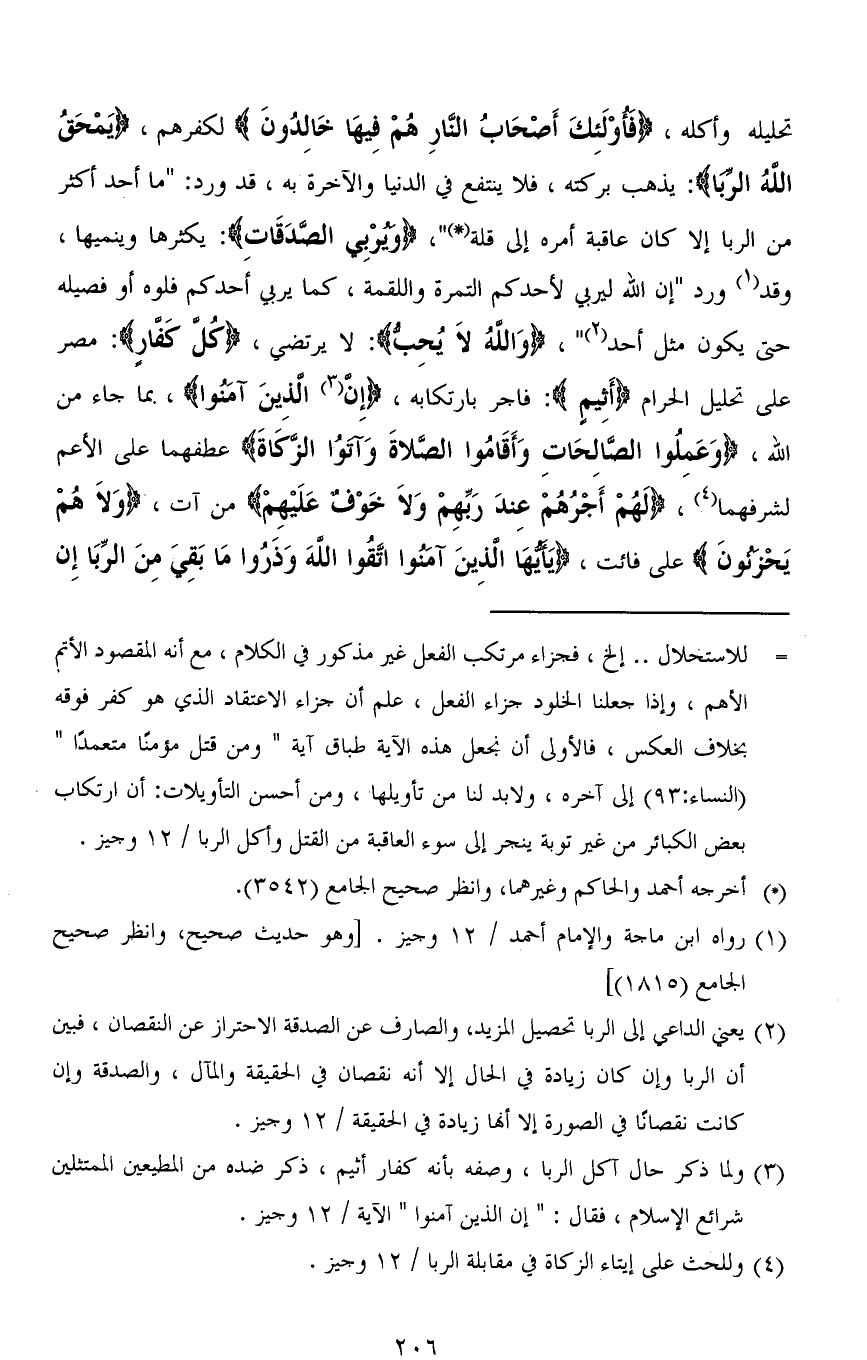 تحليله وأكله، (فأوْلَئِكَ أَصْحَابُ النَّارِ هُمْ فِيهَا خَالِدُونَ) لكفرهم، (يَمْحَقُ اللهُ الربا): يذهب بركته، فلا ينتفع في الدنيا والآخرة؛، قد ورد: " ما أحد أكثر من الربا إلا كان عاقبة أمره إلى قلة "، (وَيُرْبِي الصَّدَقَاتِ): يكثرها وينميها، وقد ورد " إن الله ليربي لأحدكم التمرة واللقمة، كما يربي أَحدكم فلوه أو فصيله حتى يكون مثل أحد "، (وَاللهُ لاَ يُحِبُّ): لا يرتضي، (كُلَّ كَفَّارٍ): مصر على تحليل الحرام (أَثِيمٍ): فاجر بارتكابه، (إِن الذِينَ آمَنُوا)، بما جاء من الله، (وَعَمِلُوا الصَّالِحَاتِ وَأَقَامُوا الصَّلَاةَ وَآتَوُا الزَّكَاةَ) عطفهما على الأعم لشرفهما َ، (لَهُمْ أَجرُهُمْ عِندَ رَبِّهِمْ وَلاَ خَوْفٌ عَلَيْهِمْ) من آت، (وَلاَ هُمْ يَحْزنونَ) على فائت، (يَا أَيُّهَا الَّذِينَ آمَنُوا اتَّقُوا اللهَ وَذَرُوا مَا بَقِيَ مِنَ الرِّبَا إِنْ
