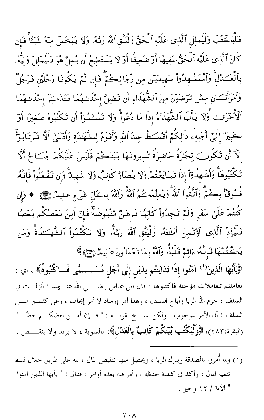 فَلْيَكْتُبْ وَلْيُمْلِلِ الَّذِي عَلَيْهِ الْحَقُّ وَلْيَتَّقِ اللهَ رَبَّهُ وَلَا يَبْخَسْ مِنْهُ شَيْئًا فَإِنْ كَانَ الَّذِي عَلَيْهِ الْحَقُّ سَفِيهًا أَوْ ضَعِيفًا أَوْ لَا يَسْتَطِيعُ أَنْ يُمِلَّ هُوَ فَلْيُمْلِلْ وَلِيُّهُ بِالْعَدْلِ وَاسْتَشْهِدُوا شَهِيدَيْنِ مِنْ رِجَالِكُمْ فَإِنْ لَمْ يَكُونَا رَجُلَيْنِ فَرَجُلٌ وَامْرَأَتَانِ مِمَّنْ تَرْضَوْنَ مِنَ الشُّهَدَاءِ أَنْ تَضِلَّ إِحْدَاهُمَا فَتُذَكِّرَ إِحْدَاهُمَا الْأُخْرَى وَلَا يَأْبَ الشُّهَدَاءُ إِذَا مَا دُعُوا وَلَا تَسْأَمُوا أَنْ تَكْتُبُوهُ صَغِيرًا أَوْ كَبِيرًا إِلَى أَجَلِهِ ذَلِكُمْ أَقْسَطُ عِنْدَ اللهِ وَأَقْوَمُ لِلشَّهَادَةِ وَأَدْنَى أَلَّا تَرْتَابُوا إِلَّا أَنْ تَكُونَ تِجَارَةً حَاضِرَةً تُدِيرُونَهَا بَيْنَكُمْ فَلَيْسَ عَلَيْكُمْ جُنَاحٌ أَلَّا تَكْتُبُوهَا وَأَشْهِدُوا إِذَا تَبَايَعْتُمْ وَلَا يُضَارَّ كَاتِبٌ وَلَا شَهِيدٌ وَإِنْ تَفْعَلُوا فَإِنَّهُ فُسُوقٌ بِكُمْ وَاتَّقُوا اللهَ وَيُعَلِّمُكُمُ اللهُ وَاللهُ بِكُلِّ شَيْءٍ عَلِيمٌ (282) وَإِنْ كُنْتُمْ عَلَى سَفَرٍ وَلَمْ تَجِدُوا كَاتِبًا فَرِهَانٌ مَقْبُوضَةٌ فَإِنْ أَمِنَ بَعْضُكُمْ بَعْضًا فَلْيُؤَدِّ الَّذِي اؤْتُمِنَ أَمَانَتَهُ وَلْيَتَّقِ اللهَ رَبَّهُ وَلَا تَكْتُمُوا الشَّهَادَةَ وَمَنْ يَكْتُمْهَا فَإِنَّهُ آثِمٌ قَلْبُهُ وَاللهُ بِمَا تَعْمَلُونَ عَلِيمٌ (283)