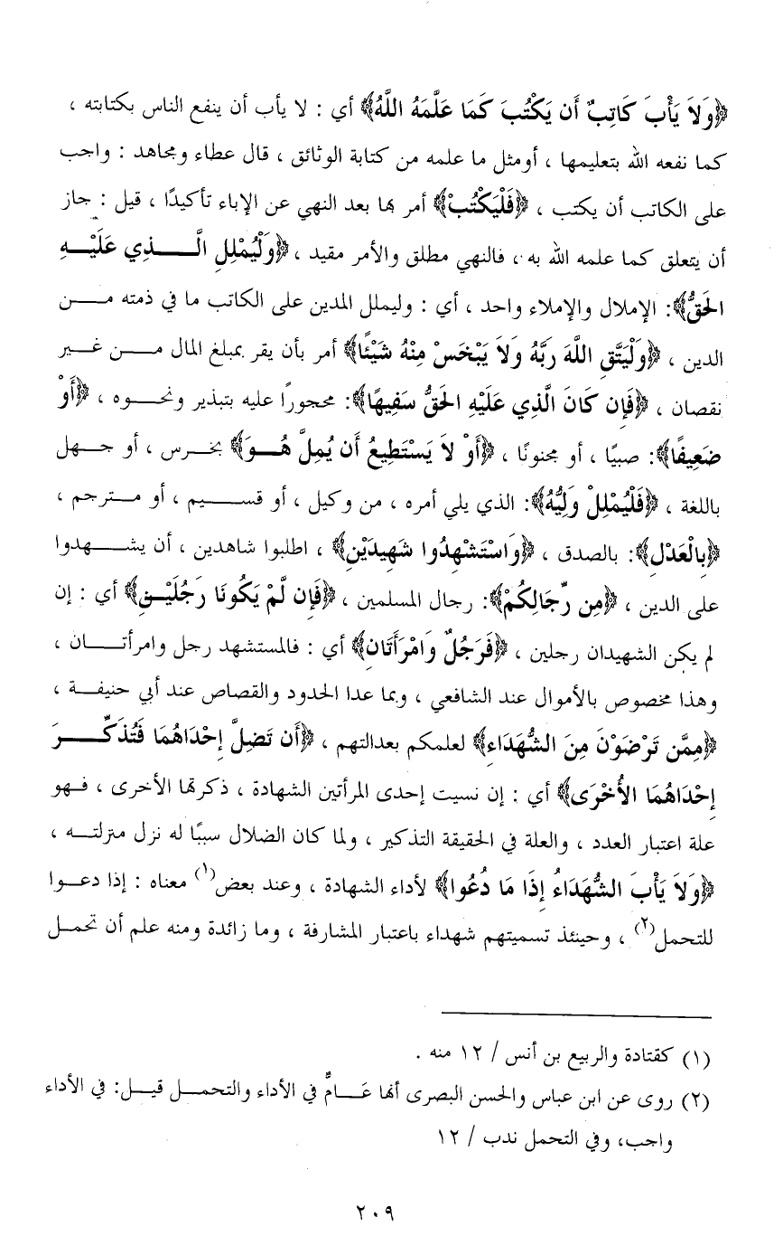 (وَلَا يَأْبَ كَاتِبٌ أَنْ يَكْتُبَ كَمَا عَلَّمَهُ اللهُ) أي: لا يأب أن ينفع الناس بكتابته، كما نفعه الله بتعليمها، أو مثل ما علمه من كتابة الوثائق، قال عطاء ومجاهد: واجب على الكاتب أن يكتب، (فَلْيَكْتُبْ) أمر بما بعد النهي عن الإباء تأكيدًا، قيل: جاز أن يتعلق كما علمه الله به، فالنهي مطلق والأمر مقيد، (وَلْيُمْلِلِ الَّذِي عَلَيْهِ الْحَقُّ): الإملال والإملاء واحد، أي: وليملل المدين على الكاتب ما في ذمته من الدين، (وَلْيَتَّقِ اللهَ رَبَّهُ وَلَا يَبْخَسْ مِنْهُ شَيْئًا) أمر بأن يقر بمبلغ المال من غير نقصان، (فَإِنْ كَانَ الَّذِي عَلَيْهِ الْحَقُّ سَفِيهًا): محجورًا عليه بتبذير ونحوه، (أَوْ ضَعِيفًا): صبيًا، أو مجنونًا، (أَوْ لَا يَسْتَطِيعُ أَنْ يُمِلَّ هُوَ) بخرس، أو جهل باللغة، (فَلْيُمْلِلْ وَلِيُّهُ): الذي يلي أمره، من وكيل، أو قسيم، أو مترجم، (بِالْعَدْلِ): بالصدق، (وَاسْتَشْهِدُوا شَهِيدَيْنِ)، اطلبوا شاهدين، أن يشهدوا على الدين، (مِن رِّجَالِكُمْ): رجال المسلمين، (فَإِنْ لَمْ يَكُونَا رَجُلَيْنِ) أي: إن لم يكن الشهيدان رجلين، (فَرَجُلٌ وَامْرَأَتَانِ) أي: فالمستشهد رجل وامرأتان، وهذا مخصوص بالأموال عند الشافعي، وبما عدا الحدود والقصاص عند أبي حنيفة، (مِمَّن تَرْضَوْنَ مِنَ الشُّهَدَاءِ) لعلمكم بعدالتهم، (أَنْ تَضِلَّ إِحْدَاهُمَا فَتُذَكِّرَ إِحْدَاهُمَا الْأُخْرَى) أي: إن نسيت إحدى المرأتين الشهادة، ذكرتها الأخرى، فهو علة اعتبار العدد، والعلة في الحقيقة التذكير، ولما كان الضلال سببًا له نزل منزلته، (وَلَا يَأْبَ الشُّهَدَاءُ إِذَا مَا دُعُوا) لأداء الشهادة، وعند بعض معناه: إذا دعوا للتحمل، وحينئذ تسميتهم شهداء باعتبار المشارفة، وما زائدة ومنه علم أن تحمل
