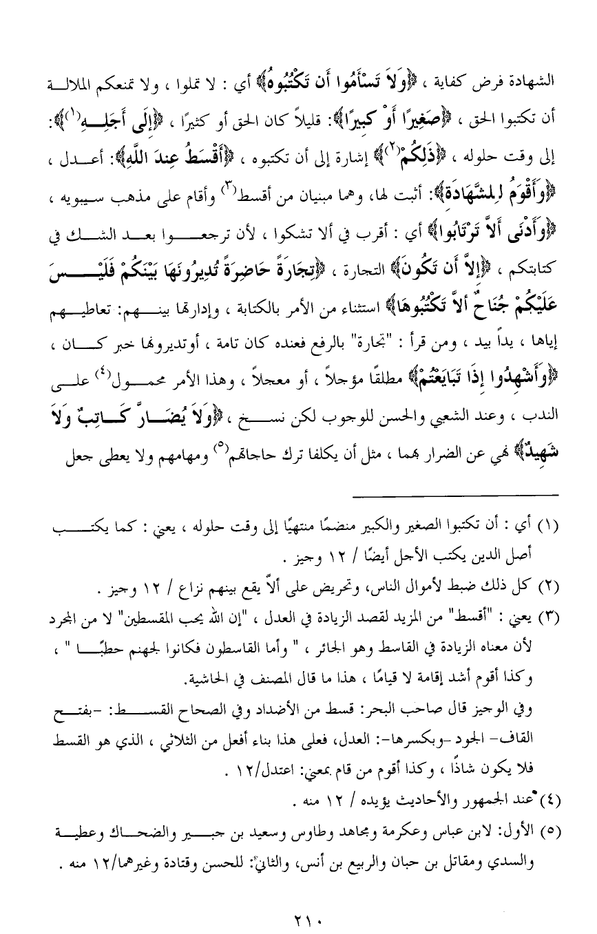 الشهادة فرض كفاية، (وَلَا تَسْأَمُوا أَنْ تَكْتُبُوهُ) أي: لا تملوا، ولا تمنعكم الملالة أن تكتبوا الحق، (صَغِيرًا أَوْ كبِيرًا): قليلاً كان الحق أو كثيرًا، (إِلَى أَجَلِهِ): إلى وقت حلوله، (ذلِكُمْ) إشارة إلى أن تكتبوه، (أَقْسَطُ عِنْدَ اللهِ): أعدل، (وَأَقْوَمُ لِلشَّهَادَةِ): أثبت لها، وهما مبنيان من أقسط وأقام على مذهب سيبويه، (وَأَدْنَى أَلَّا تَرْتَابُوا) أي: أقرب في ألا تشكوا، لأن ترجعوا بعد الشك في كتابتكم، (إِلا أَن تَكُونَ) التجارة، (تِجَارَةً حَاضِرَةً تُدِيرُونَهَا بَيْنَكُمْ فَلَيْسَ عَلَيْكُمْ جُنَاحٌ أَلَّا تَكْتُبُوهَا) استثناء من الأمر بالكتابة، وإدارتها بينهم: تعاطيهم إياها، يداً بيد، ومن قرأ: (تِجَارَةٌ) بالرفع فعنده كان تامة، أو تديرونها خبر كان، (وَأَشْهِدُوا إِذَا تَبَايَعْتُمْ) مطلقًا مؤجلاً، أو معجلاً، وهذا الأمر محمول على الندب، وعند الشعبي والحسن للوجوب لكن نسخ، (وَلَا يُضَارَّ كَاتِبٌ وَلَا شَهِيدٌ) نهي عن الضرار بهما، مثل أن يكلفا ترك حاجاتهم ومهامهم ولا يعطى جعل