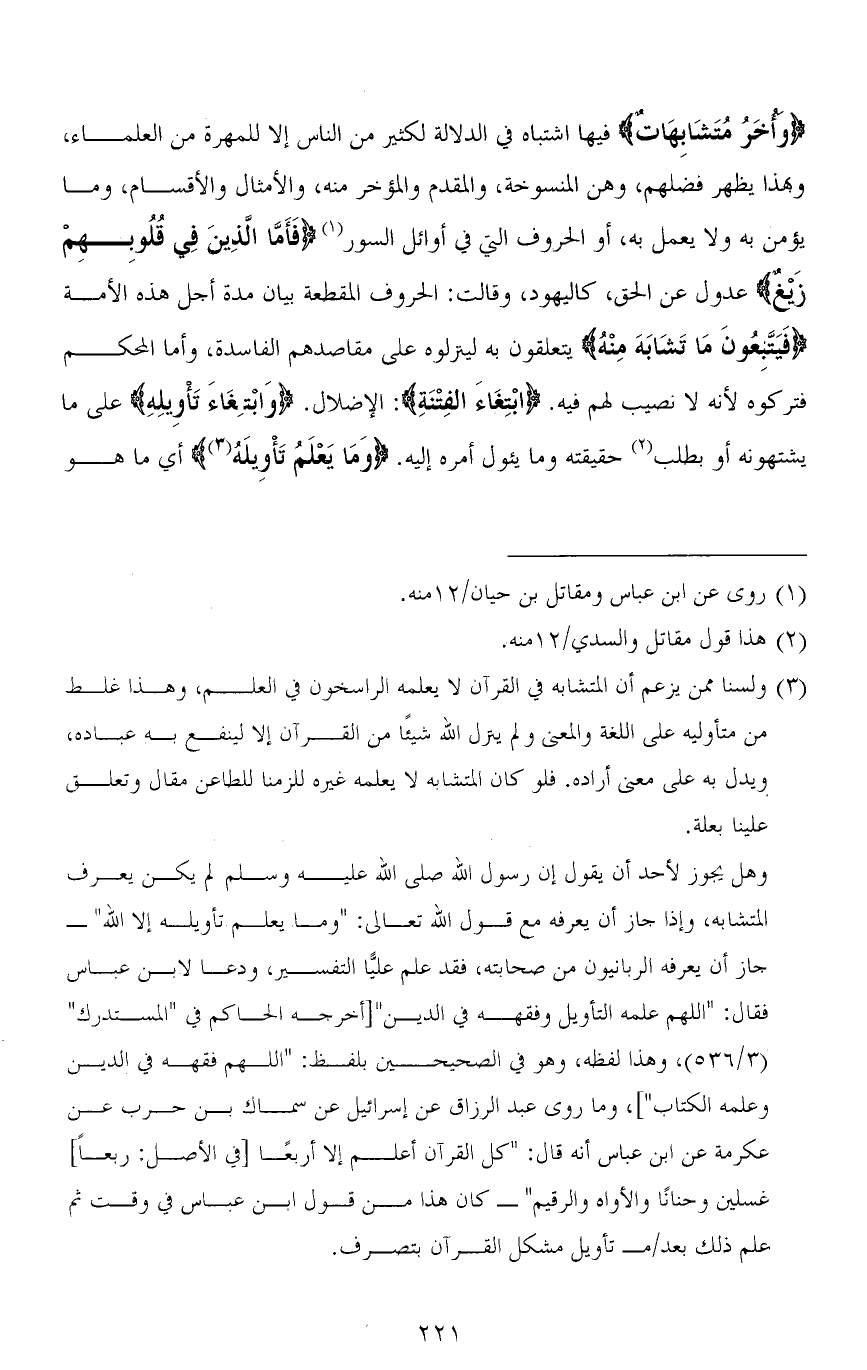 (وَأُخَرُ مُتَشَابِهَاتٌ) فيها اشتباه في الدلالة لكثير من الناس إلا للمهرة من العلماء، وهذا يظهر فضلهم، وهن المنسوخة، والمقدم والمؤخر منه، والأمثال والأقسام، وما يؤمن به ولا يعمل به، أو الحروف التي فِي أوائل السور (فَأَمَّا الَّذِينَ فِي قُلُوبِهِمْ زَيْغٌ) عدول عن الحق، كاليهود، وقالت: الحروف المقطعة بيان مدة أجل هذه الأمة (فَيَتَّبِعُونَ مَا تَشَابَهَ مِنْهُ) يتعلقون به لينزلوه على مقاصدهم الفاسدة، وأما المحكم فتركوه لأنه لا نصيب لهم فيه. (ابْتِغَاءَ الْفِتْنَةِ): الإضلال. (وَابْتِغَاءَ تَأْوِيلِهِ) على ما يشتهونه أو بطلب حقيقته وما يئول أمره إليه. (وَمَا يَعْلَمُ تَأْوِيلَهُ) أي ما هو