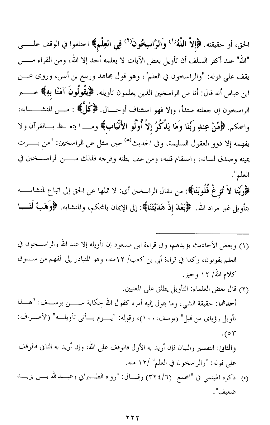 الحق، أو حقيقته. (إِلَّا اللهُ وَالرَّاسِخُونَ فِي الْعِلْمِ) اختلفوا في الوقف على " الله " عند أكثر السلف أن تأويل بعض الآيات لا يعلمه أحد إلا الله، ومن القراء من يقف على قوله: " والراسخون في العلم "، وهو قول مجاهد وربيع بن أنس، وروي عن ابن عباس أنه قال: أنا من الراسخين الذين يعلمون تأويله. (يَقُولُونَ آمَنَّا بِهِ) خبر الراسخون إن جعلته مبتدأ، وإلا فهو استئناف أو حال. (كُلٌّ): من المتشابه، والمحكم. (مِنْ عِنْدِ رَبِّنَا وَمَا يَذَّكَّرُ إِلَّا أُولُو الْأَلْبَابِ) وما يتعظ بالقرآن ولا يفهمه إلا ذوو العقول السليمة، وفي الحديث حين سئل عن الراسخين: " من برت يمينه وصدق لسانه، واستقام قلبه، ومن عف بطنه وفرجه فذلك من الراسخين في العلم ".