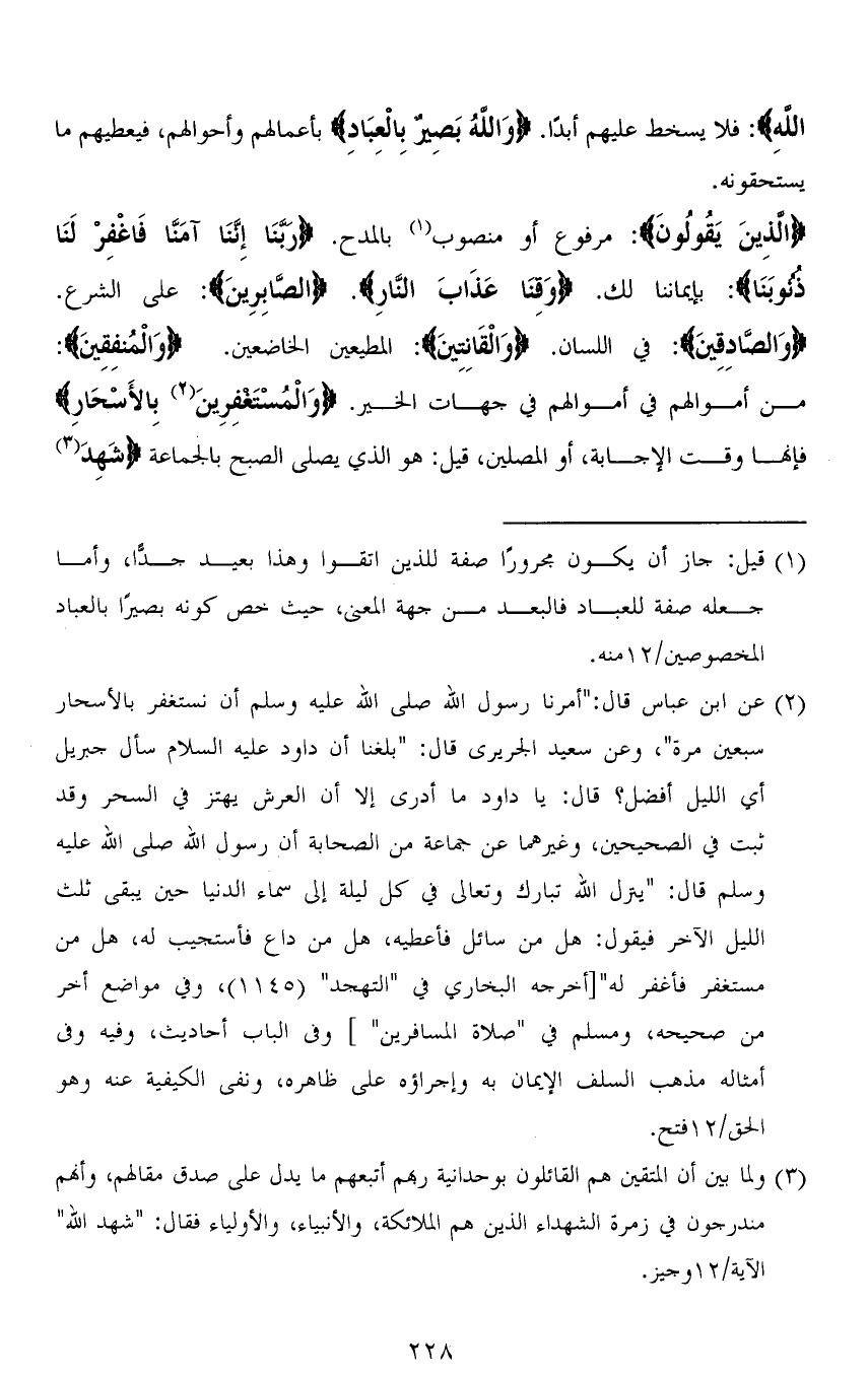 (وَالصَّادِقِينَ): في اللسان. (وَالْقَانِتِينَ): المطعين الخاضعين. (وَالْمُنفِقِينَ): من أموالهم في أموالهم في جهات الخير. (وَالْمُسْتَغْفِرِينَ بِالْأَسْحَارِ) فإنها وقت الإجابة، أو المصلين، قيل: هو الذي يصلي الصبح بالجماعة (شَهِدَ