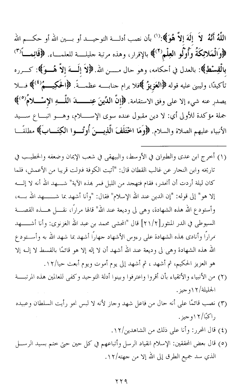 اللهُ أَنَّهُ لَا إِلَهَ إِلَّا هُوَ): بأن نصب أدلة التوحيد أو بين الله أو حكم الله (وَالْمَلاِئكَةُ وأُولو العِلْمِ) بالإقرار، وهذه مرتبة جليلة للعلماء. (قَائِماً بِالْقِسْطِ): بالعدل في أحكامه، وهو حال من الله. (لاَ إِلَهَ إِلَّا هُوَ): كرره تأكيدًا، وليبنى عليه قوله (العَزِيزُ) فلا يرام جنابه عظمةً. (الحَكِيمُ) فلا يصدر عنه شيء إلا على وفق الاستقامة. (إِنَّ الدِّينَ عِندَ اللهِ الإِسْلامُ) جملة مؤكدة للأولى أي: لا دين مقبول عنده سوى الإسلام، وهو اتباع سيد الأنبياء عليهم الصلاة والسلام. (وَمَا اخْتَلَفَ الَّذِينَ أوتُوا الكِتَابَ) مطلقًا