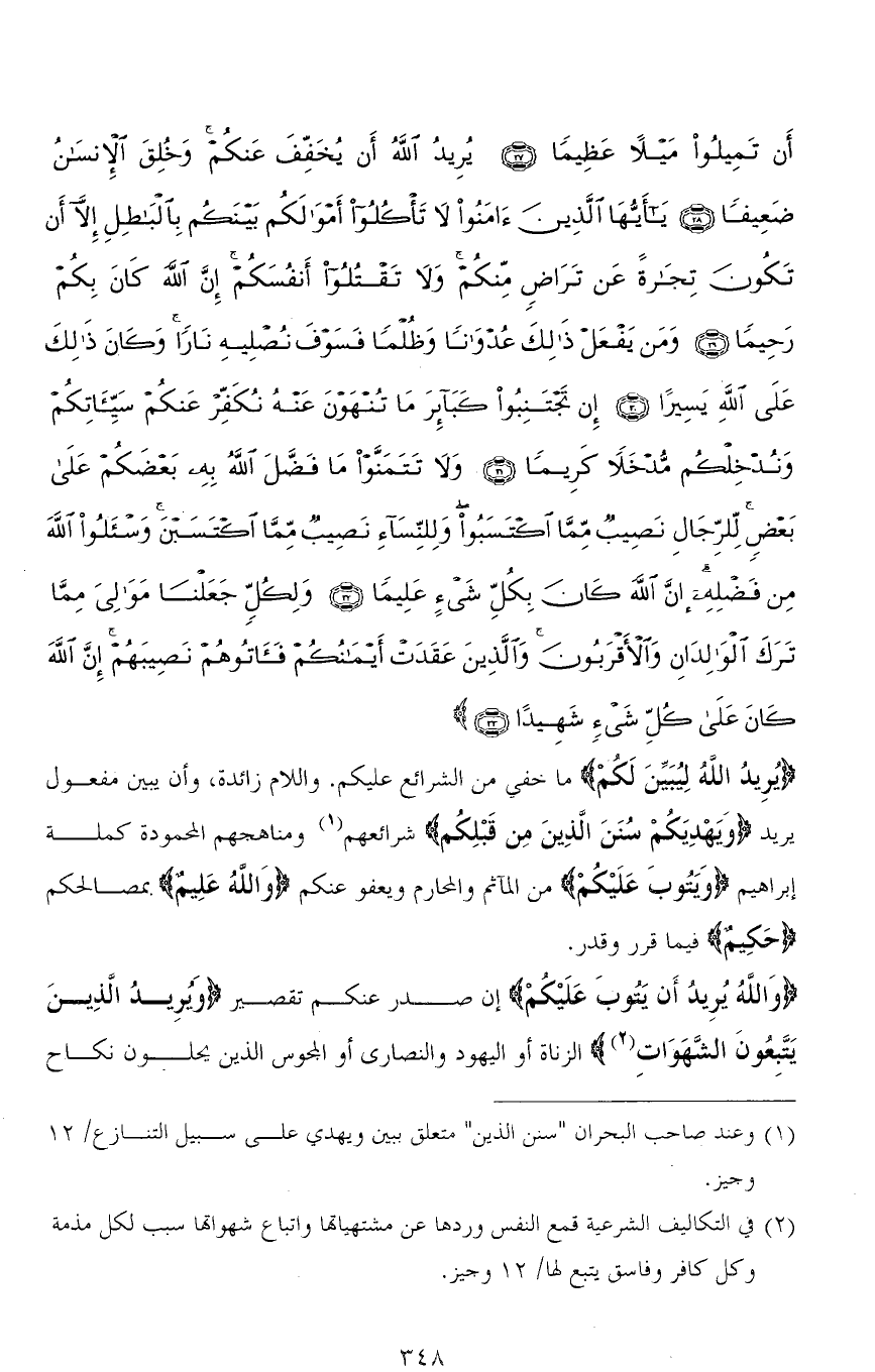 أَنْ تَمِيلُوا مَيْلًا عَظِيمًا (27) يُرِيدُ اللهُ أَنْ يُخَفِّفَ عَنْكُمْ وَخُلِقَ الْإِنْسَانُ ضَعِيفًا (28) يَا أَيُّهَا الَّذِينَ آمَنُوا لَا تَأْكُلُوا أَمْوَالَكُمْ بَيْنَكُمْ بِالْبَاطِلِ إِلَّا أَنْ تَكُونَ تِجَارَةً عَنْ تَرَاضٍ مِنْكُمْ وَلَا تَقْتُلُوا أَنْفُسَكُمْ إِنَّ اللهَ كَانَ بِكُمْ رَحِيمًا (29) وَمَنْ يَفْعَلْ ذَلِكَ عُدْوَانًا وَظُلْمًا فَسَوْفَ نُصْلِيهِ نَارًا وَكَانَ ذَلِكَ عَلَى اللهِ يَسِيرًا (30) إِنْ تَجْتَنِبُوا كَبَائِرَ مَا تُنْهَوْنَ عَنْهُ نُكَفِّرْ عَنْكُمْ سَيِّئَاتِكُمْ وَنُدْخِلْكُمْ مُدْخَلًا كَرِيمًا (31) وَلَا تَتَمَنَّوْا مَا فَضَّلَ اللهُ بِهِ بَعْضَكُمْ عَلَى بَعْضٍ لِلرِّجَالِ نَصِيبٌ مِمَّا اكْتَسَبُوا وَلِلنِّسَاءِ نَصِيبٌ مِمَّا اكْتَسَبْنَ وَاسْأَلُوا اللهَ مِنْ فَضْلِهِ إِنَّ اللهَ كَانَ بِكُلِّ شَيْءٍ عَلِيمًا (32) وَلِكُلٍّ جَعَلْنَا مَوَالِيَ مِمَّا تَرَكَ الْوَالِدَانِ وَالْأَقْرَبُونَ وَالَّذِينَ عَقَدَتْ أَيْمَانُكُمْ فَآتُوهُمْ نَصِيبَهُمْ إِنَّ اللهَ كَانَ عَلَى كُلِّ شَيْءٍ شَهِيدًا (33)