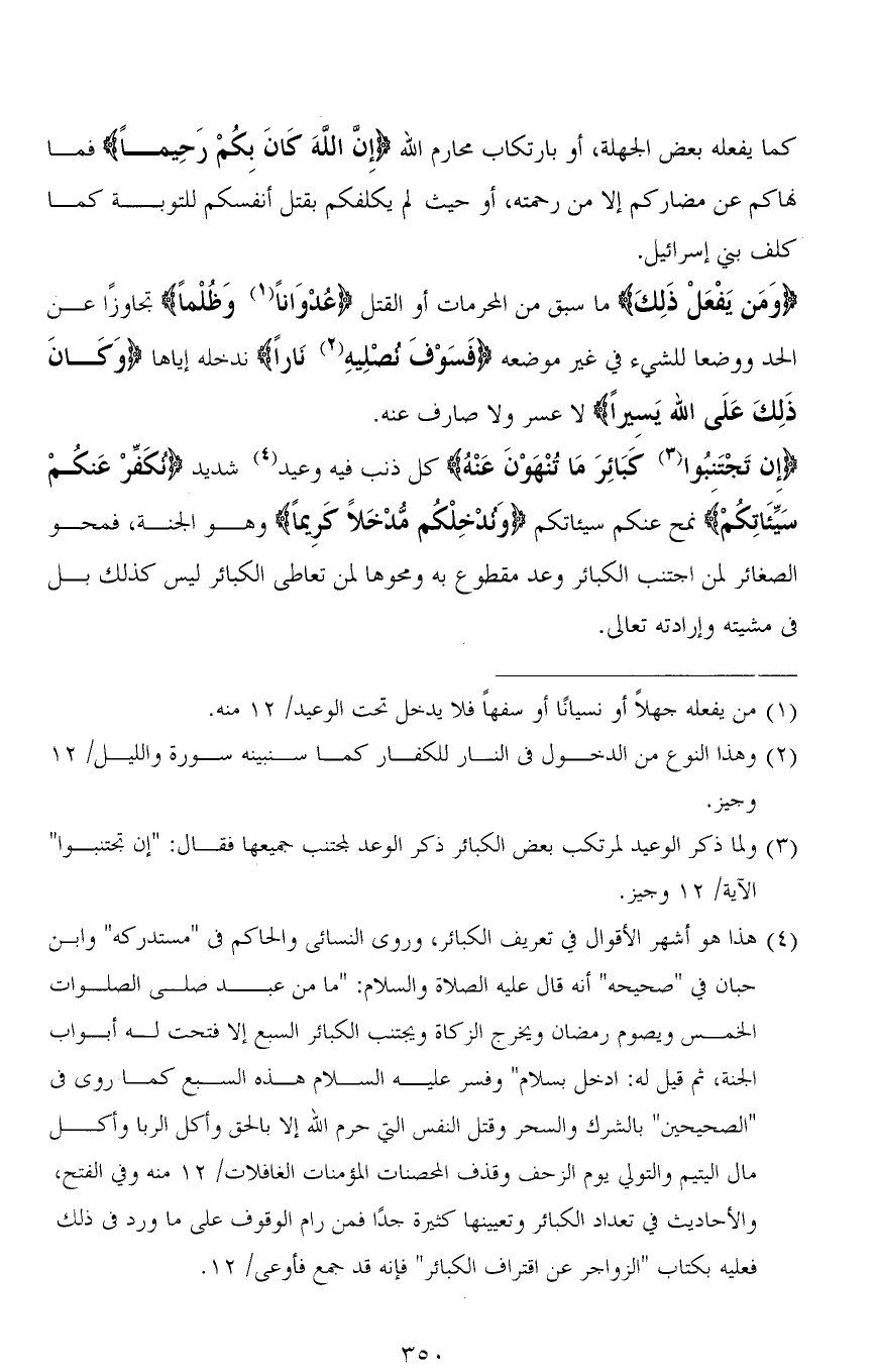 (إِنْ تَجْتَنِبُوا كَبَائِرَ مَا تُنْهَوْنَ عَنْهُ) كل ذنب فيه وعيد شديد (نُكَفِّرْ عَنْكُمْ سَيِّئَاتِكُمْ) نمح عنكم سيئاتكم (وَنُدْخِلْكُمْ مُدْخَلًا كَرِيمًا) وهو الجنة، فمحو الصغائر لمن أجتنب الكبائر وعد مقطوع به ومحوها لمن تعاطى الكبائر ليس كذلك بل فى مشيته وإرادته تعالى.