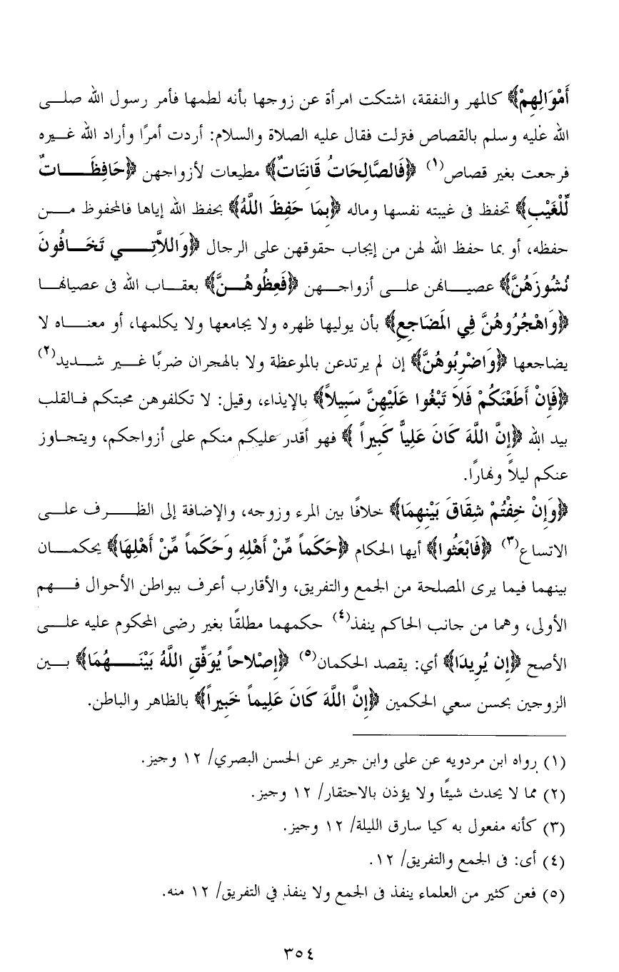 أَموالِهِمْ) كالمهر والنفقة، اشتكت امرأة عن زوجها بأنه لطمها فأمر رسول الله صلى الله عليه وسلم بالقصاص فنزلت فقال عليه الصلاة والسلام: أردت أمرًا وأراد الله غيره فرجعت بغير قصاص (فالصَّالِحَاتُ قَانتَاتٌ) مطيعات لأزواجهن (حَافِظَاتٌ لِّلْغَيْبِ) تحفظ في غيبته نفسها وماله (بِمَا حَفِظَ اللهُ) بحفظ الله إياها فالمحفوظ من حفظه، أو بما حفظ الله لهن من إيجاب حقوقهن على الرجال (وَاللَّاتِي تَخَافُونَ (نُشُوزَهُنَّ) عصيانهن على أزواجهن (فَعِظُوهُنَّ) بعقاب الله في عصيانها (وَاهْجُرُوهُنَّ فِي الْمَضَاجِعِ) بأن يوليها ظهره ولا يجامعها ولا يكلمها، أو معناه لا يضاجعها (وَاضْرِبُوهُنَّ) إن لم يرتدعن بالموعظة ولا بالهجران ضربًا غير شديد (فَإِنْ أَطَعْنَكُمْ فَلَا تَبْغُوا عَلَيْهِنَّ سَبِيلًا) بالإيذاء، وقيل: لا تكلفوهن محبتكم فالقلب بيد الله (إِنَّ اللهَ كَانَ عَلِيًّا كَبِيرًا) فهو أقَدرَ عليكم منكم على أزواجكم، ويتجاوز عنكم ليلاً ونهارًا.