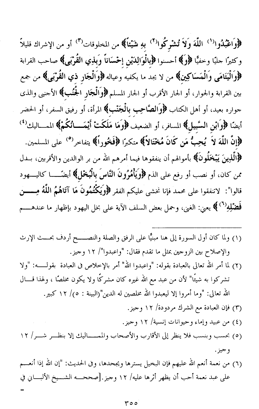 (وَاعْبُدُوا اللهَ وَلَا تُشْرِكُوا بِهِ شَيْئًا) من المخلوقات أو من الإشراك قليلاً وكثيرًا جليًّا وخفيًّا (وَ) أحسنوا (بِالْوَالِدَيْنِ إِحْسَانًا وَبِذِي الْقُرْبَى) صاحب القرابة (وَالْيَتَامَى وَالْمَسَاكِينِ) من لا يجد ما يكفيه وعياله (وَالْجَارِ ذِي الْقُرْبَى) من جمع بين القرابة والجوار، أو الجار الأقرب أو الجار المسلم (وَالْجَارِ الْجُنُبِ) الأجنبي والذي جواره بعيد، أو أهل الكتاب (وَالصَّاحِبِ بِالْجَنْبِ) المرأة، أو رفيق السفر، أو الحضر أيضًا (وَابْنِ السبِيلِ) المسافر، أو الضعيف (وَمَا ملَكَتْ أَيْمَانُكمْ) المماليك (إِنَّ اللهَ لاَ يُحِبُّ مَن كَانَ مُخْتَالاً) متكبرًا (فَخُوراً) يتفاخر على المسلمين.