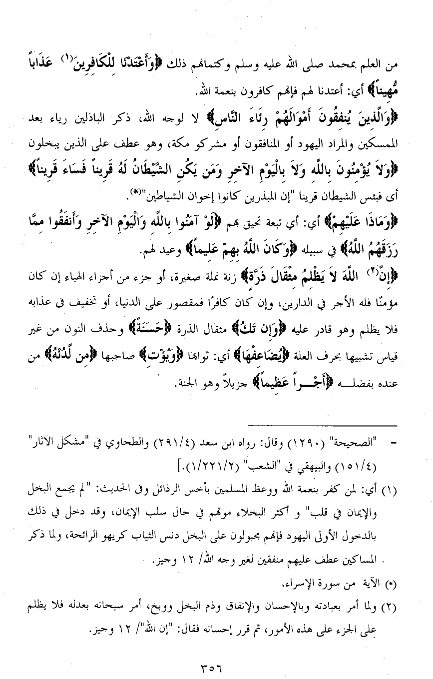 (وَالَّذِينَ يُنْفِقُونَ أَمْوَالَهُمْ رِئَاءَ النَّاسِ) لا لوجه الله، ذكر الباذلين رياء بعد الممسكين والمراد اليهود أو المنافقون أو مشركو مكة، وهو عطف على الذين يبخلون (وَلَا يُؤْمِنُونَ بِاللهِ وَلَا بِالْيَوْمِ الْآخِرِ وَمَنْ يَكُنِ الشَّيْطَانُ لَهُ قَرِينًا فَسَاءَ قَرِينًا) أى فبئس الشيطان قرينًا (إن المبذرين كانوا إخوان الشياطين).