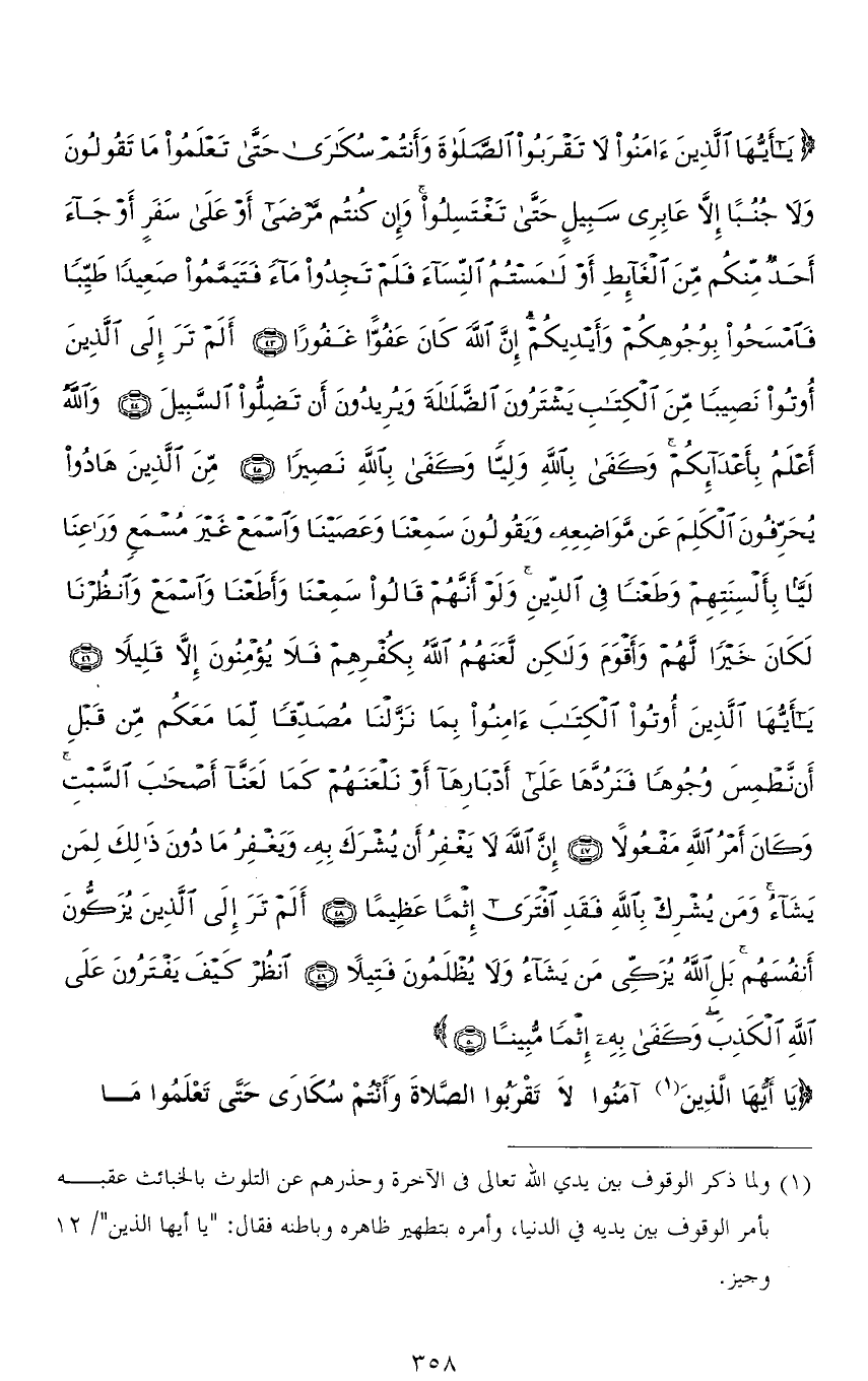 (يَا أَيُّهَا الَّذِينَ آمَنُوا لَا تَقْرَبُوا الصَّلَاةَ وَأَنْتُمْ سُكَارَى حَتَّى تَعْلَمُوا مَا تَقُولُونَ وَلَا جُنُبًا إِلَّا عَابِرِي سَبِيلٍ حَتَّى تَغْتَسِلُوا وَإِنْ كُنْتُمْ مَرْضَى أَوْ عَلَى سَفَرٍ أَوْ جَاءَ أَحَدٌ مِنْكُمْ مِنَ الْغَائِطِ أَوْ لَامَسْتُمُ النِّسَاءَ فَلَمْ تَجِدُوا مَاءً فَتَيَمَّمُوا صَعِيدًا طَيِّبًا فَامْسَحُوا بِوُجُوهِكُمْ وَأَيْدِيكُمْ إِنَّ اللهَ كَانَ عَفُوًّا غَفُورًا (43) أَلَمْ تَرَ إِلَى الَّذِينَ أُوتُوا نَصِيبًا مِنَ الْكِتَابِ يَشْتَرُونَ الضَّلَالَةَ وَيُرِيدُونَ أَنْ تَضِلُّوا السَّبِيلَ (44) وَاللهُ أَعْلَمُ بِأَعْدَائِكُمْ وَكَفَى بِاللهِ وَلِيًّا وَكَفَى بِاللهِ نَصِيرًا (45) مِنَ الَّذِينَ هَادُوا يُحَرِّفُونَ الْكَلِمَ عَنْ مَوَاضِعِهِ وَيَقُولُونَ سَمِعْنَا وَعَصَيْنَا وَاسْمَعْ غَيْرَ مُسْمَعٍ وَرَاعِنَا لَيًّا بِأَلْسِنَتِهِمْ وَطَعْنًا فِي الدِّينِ وَلَوْ أَنَّهُمْ قَالُوا سَمِعْنَا وَأَطَعْنَا وَاسْمَعْ وَانْظُرْنَا لَكَانَ خَيْرًا لَهُمْ وَأَقْوَمَ وَلَكِنْ لَعَنَهُمُ اللهُ بِكُفْرِهِمْ فَلَا يُؤْمِنُونَ إِلَّا قَلِيلًا (46) يَا أَيُّهَا الَّذِينَ أُوتُوا الْكِتَابَ آمِنُوا بِمَا نَزَّلْنَا مُصَدِّقًا لِمَا مَعَكُمْ مِنْ قَبْلِ أَنْ نَطْمِسَ وُجُوهًا فَنَرُدَّهَا عَلَى أَدْبَارِهَا أَوْ نَلْعَنَهُمْ كَمَا لَعَنَّا أَصْحَابَ السَّبْتِ وَكَانَ أَمْرُ اللهِ مَفْعُولًا (47) إِنَّ اللهَ لَا يَغْفِرُ أَنْ يُشْرَكَ بِهِ وَيَغْفِرُ مَا دُونَ ذَلِكَ لِمَنْ يَشَاءُ وَمَنْ يُشْرِكْ بِاللهِ فَقَدِ افْتَرَى إِثْمًا عَظِيمًا (48) أَلَمْ تَرَ إِلَى الَّذِينَ يُزَكُّونَ أَنْفُسَهُمْ بَلِ اللهُ يُزَكِّي مَنْ يَشَاءُ وَلَا يُظْلَمُونَ فَتِيلًا (49) انْظُرْ كَيْفَ يَفْتَرُونَ عَلَى اللهِ الْكَذِبَ وَكَفَى بِهِ إِثْمًا مُبِينًا (50)