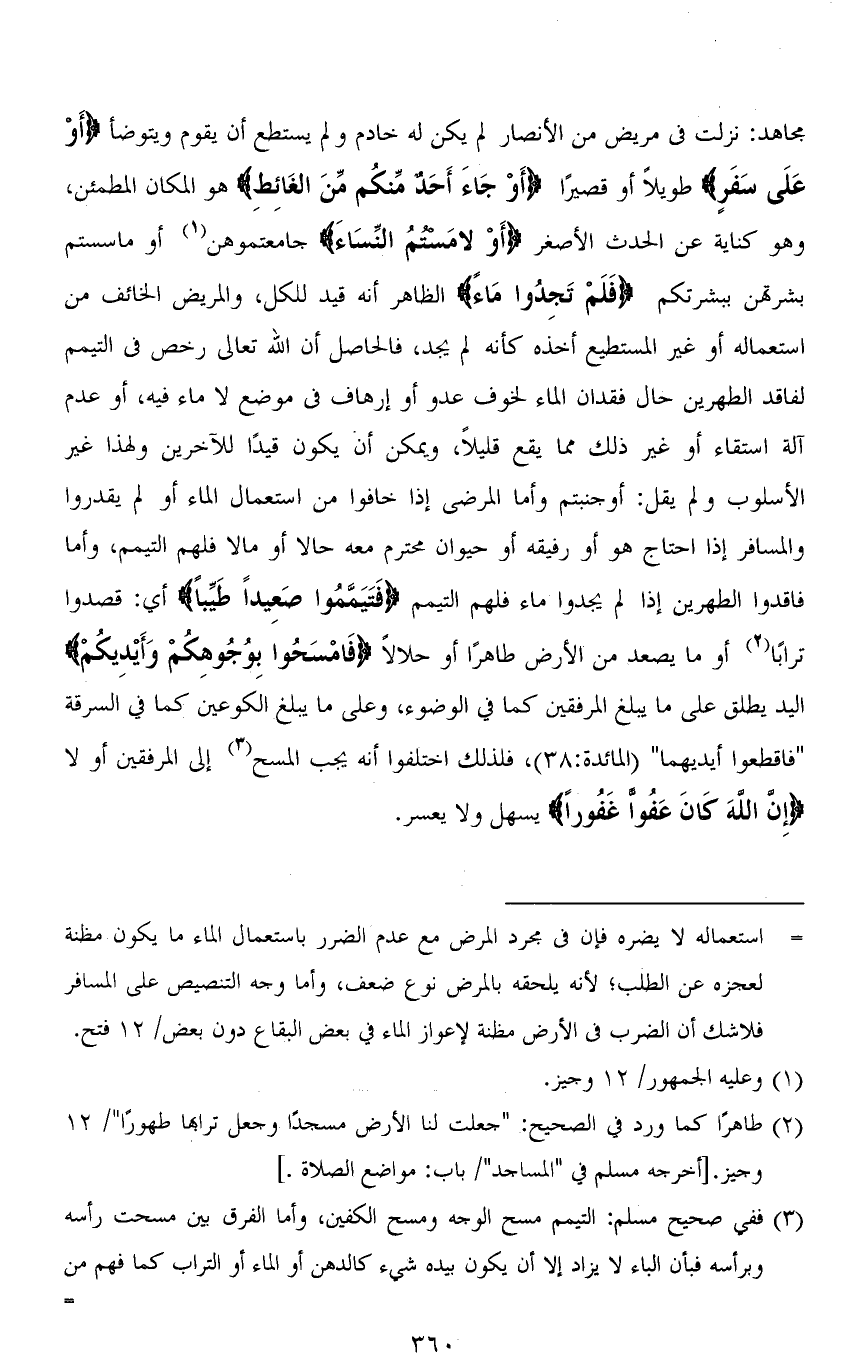 مجاهد: نزلت في مريض من الأنصار لم يكن له خادم ولم يستطع أن يقوم ويتوضأ (أَوْ عَلَى سَفَرٍ) طويلاً أو قصيرًا (أَوْ جَاءَ أَحَدٌ منكُم مِّنَ الغَائِطِ) هو المكان المطمئن، وهو كناية عن الحدث الأصغر (أَوْ لَامَسْتُمُ النِّسَاءَ) جامعتموهن أو ماسستم بشرتهن ببشرتكم (فَلَمْ تَجِدُوا مَاءً) الظاهر أنه قيد للكل، والمريض الخائف من استعماله أو غير المستطيع أخذه كأنه لم يجد، فالحاصل أن الله تعالى رخص في التيمم لفاقد الطهرين حال فقدان الماء لخوف عدو أو إرهاف في موضع لا ماء فيه، أو عدم آلة استقاء أو غير ذلك مما يقع قليلاً، ويمكن أن يكون قيدًا للآخرين ولهذا غير الأسلوب ولم يقل: أو جنبتم وأما المرضى إذا خافوا من استعمال الماء أو لم يقدروا والمسافر إذا احتاج هو أو رفيقه أو حيوان محترم معه حالاً أو مالاً فلهم التيمم، وأما فاقدوا الطهرين إذا لم يجدوا ماء فلهم التيمم (فَتَيَمَّمُوا صَعِيدًا طَيِّبًا) أي: قصدوا ترابًا أو ما يصعد من الأرض طاهرًا أو حلالاً (فَامْسَحُوا بِوُجُوهِكمْ وَأَيْدِيكُمْ) اليد يطلق على ما يبلغ المرفقين كما في الوضوء، وعلى ما يبلغ الكوعين كما في السرقة " فاقطعوا أيديهما " (المائدة: 38)، فلذلك اختلفوا أنه يجب المسح إلى المرفقين أو لا (إِنَّ اللهَ كَانَ عَفُوًّا غَفُورًا) يسهل ولا يعسر.