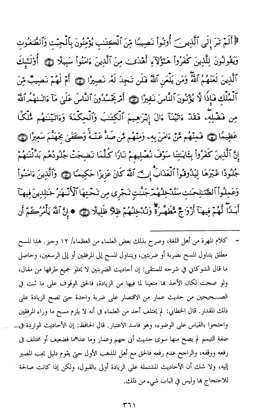 (أَلَمْ تَرَ إِلَى الَّذِينَ أُوتُوا نَصِيبًا مِنَ الْكِتَابِ يَشْتَرُونَ الضَّلَالَةَ وَيُرِيدُونَ أَنْ تَضِلُّوا السَّبِيلَ (44) وَاللهُ أَعْلَمُ بِأَعْدَائِكُمْ وَكَفَى بِاللهِ وَلِيًّا وَكَفَى بِاللهِ نَصِيرًا (45) مِنَ الَّذِينَ هَادُوا يُحَرِّفُونَ الْكَلِمَ عَنْ مَوَاضِعِهِ وَيَقُولُونَ سَمِعْنَا وَعَصَيْنَا وَاسْمَعْ غَيْرَ مُسْمَعٍ وَرَاعِنَا لَيًّا بِأَلْسِنَتِهِمْ وَطَعْنًا فِي الدِّينِ وَلَوْ أَنَّهُمْ قَالُوا سَمِعْنَا وَأَطَعْنَا وَاسْمَعْ وَانْظُرْنَا لَكَانَ خَيْرًا لَهُمْ وَأَقْوَمَ وَلَكِنْ لَعَنَهُمُ اللهُ بِكُفْرِهِمْ فَلَا يُؤْمِنُونَ إِلَّا قَلِيلًا (46) يَا أَيُّهَا الَّذِينَ أُوتُوا الْكِتَابَ آمِنُوا بِمَا نَزَّلْنَا مُصَدِّقًا لِمَا مَعَكُمْ مِنْ قَبْلِ أَنْ نَطْمِسَ وُجُوهًا فَنَرُدَّهَا عَلَى أَدْبَارِهَا أَوْ نَلْعَنَهُمْ كَمَا لَعَنَّا أَصْحَابَ السَّبْتِ وَكَانَ أَمْرُ اللهِ مَفْعُولًا (47) إِنَّ اللهَ لَا يَغْفِرُ أَنْ يُشْرَكَ بِهِ وَيَغْفِرُ مَا دُونَ ذَلِكَ لِمَنْ يَشَاءُ وَمَنْ يُشْرِكْ بِاللهِ فَقَدِ افْتَرَى إِثْمًا عَظِيمًا (48) أَلَمْ تَرَ إِلَى الَّذِينَ يُزَكُّونَ أَنْفُسَهُمْ بَلِ اللهُ يُزَكِّي مَنْ يَشَاءُ وَلَا يُظْلَمُونَ فَتِيلًا (49) انْظُرْ كَيْفَ يَفْتَرُونَ عَلَى اللهِ الْكَذِبَ وَكَفَى بِهِ إِثْمًا مُبِينًا (50) أَلَمْ تَرَ إِلَى الَّذِينَ أُوتُوا نَصِيبًا مِنَ الْكِتَابِ يُؤْمِنُونَ بِالْجِبْتِ وَالطَّاغُوتِ وَيَقُولُونَ لِلَّذِينَ كَفَرُوا هَؤُلَاءِ أَهْدَى مِنَ الَّذِينَ آمَنُوا سَبِيلًا (51) أُولَئِكَ الَّذِينَ لَعَنَهُمُ اللهُ وَمَنْ يَلْعَنِ اللهُ فَلَنْ تَجِدَ لَهُ نَصِيرًا (52) أَمْ لَهُمْ نَصِيبٌ مِنَ الْمُلْكِ فَإِذًا لَا يُؤْتُونَ النَّاسَ نَقِيرًا (53) أَمْ يَحْسُدُونَ النَّاسَ عَلَى مَا آتَاهُمُ اللهُ مِنْ فَضْلِهِ فَقَدْ آتَيْنَا آلَ إِبْرَاهِيمَ الْكِتَابَ وَالْحِكْمَةَ وَآتَيْنَاهُمْ مُلْكًا عَظِيمًا (54) فَمِنْهُمْ مَنْ آمَنَ بِهِ وَمِنْهُمْ مَنْ صَدَّ عَنْهُ وَكَفَى بِجَهَنَّمَ سَعِيرًا (55) إِنَّ الَّذِينَ كَفَرُوا بِآيَاتِنَا سَوْفَ نُصْلِيهِمْ نَارًا كُلَّمَا نَضِجَتْ جُلُودُهُمْ بَدَّلْنَاهُمْ جُلُودًا غَيْرَهَا لِيَذُوقُوا الْعَذَابَ إِنَّ اللهَ كَانَ عَزِيزًا حَكِيمًا (56) وَالَّذِينَ آمَنُوا وَعَمِلُوا الصَّالِحَاتِ سَنُدْخِلُهُمْ جَنَّاتٍ تَجْرِي مِنْ تَحْتِهَا الْأَنْهَارُ خَالِدِينَ فِيهَا أَبَدًا لَهُمْ فِيهَا أَزْوَاجٌ مُطَهَّرَةٌ وَنُدْخِلُهُمْ ظِلًّا ظَلِيلًا (57) إِنَّ اللهَ يَأْمُرُكُمْ أَنْ