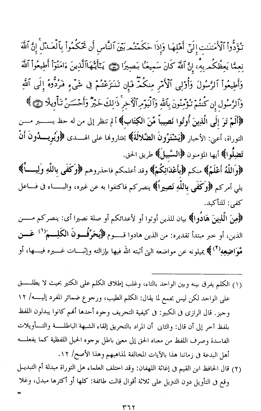 تُؤَدُّوا الْأَمَانَاتِ إِلَى أَهْلِهَا وَإِذَا حَكَمْتُمْ بَيْنَ النَّاسِ أَنْ تَحْكُمُوا بِالْعَدْلِ إِنَّ اللهَ نِعِمَّا يَعِظُكُمْ بِهِ إِنَّ اللهَ كَانَ سَمِيعًا بَصِيرًا (58) يَا أَيُّهَا الَّذِينَ آمَنُوا أَطِيعُوا اللهَ وَأَطِيعُوا الرَّسُولَ وَأُولِي الْأَمْرِ مِنْكُمْ فَإِنْ تَنَازَعْتُمْ فِي شَيْءٍ فَرُدُّوهُ إِلَى اللهِ وَالرَّسُولِ إِنْ كُنْتُمْ تُؤْمِنُونَ بِاللهِ وَالْيَوْمِ الْآخِرِ ذَلِكَ خَيْرٌ وَأَحْسَنُ تَأْوِيلًا (59)