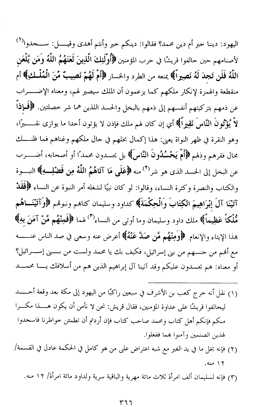 اليهود: ديننا خير أم دين محمد؟ فقالوا: دينكم خير وأنتم أهدى وقيل: سجدوا لأصنامهم حين حالفوا قريشًا في حرب المؤمنين (أُولَئِكَ الَّذِينَ لَعَنَهُمُ اللهُ وَمَنْ يَلْعَنِ اللهُ فَلَنْ تَجِدَ لَهُ نَصِيرًا) يمنعه من الطرد والخسار (أَمْ لَهُمْ نَصِيبٌ منَ الْمُلْكِ) أم منقطعة والهمزة لإنكار ملكهم كما يزعمون أن الملك سيصير لهم، ومعناه الإضراب عن ذمهم بتزكيتهم أنفسهم إلى ذمهم بالبخل والحسد اللذين هما شر خصلتين. (فَإِذًا لَا يُؤْتُونَ النَّاسَ نَقِيرًا) أي إن كان لهم ملك فإذن لا يؤتون أحدًا ما يوازي نقيرًا، وهو النقرة في ظهر النواة يعني: هذا إكمال بخلهم في حال ملكهم وغناهم فما ظنك بحال فقرهم وذلهم (أَمْ يَحْسُدُون النَّاسَ) بل يحسدون محمدًا أو أصحابه، أضرب عن البخل إلى الحسد الذي هو شر منه (عَلَى مَا آتاهُمُ اللهُ مِن فَضْلِهِ) النبوة والكتاب والنصرة وكثرة النساء، وقالوا: لو كان نبيًا لشغله أمر النبوة عن النساء (فقَدْ آتيْنَا آلَ إِبْرَاهِيمَ الْكِتَابَ وَالْحِكْمَةَ) كداود وسليمان كتابهم ونبوتهم (وَآتيْنَاهُم مُّلْكاً عَظِيماً) ملك داود وسليمان وما أوتى من النساء لهما (فَمِنْهُم مَنْ آمَنَ بِهِ) بهذا الإيتاء والإنعام (وَمِنْهُمْ مَنْ صَدَّ عَنْهُ) أعرض عنه وسعى في صد الناس عنه مع أنهم من جنسهم من بني إسرائيل، فكيف بك يا محمد ولست من بني إسرائيل؟ أو معناه: هم يحسدون عليكم وقد آتينا آل إبراهيم الذين هم من أسلافك يا محمد