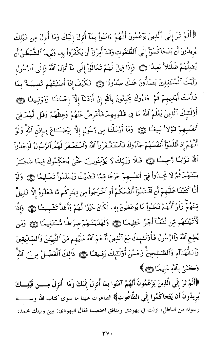 (أَلَمْ تَرَ إِلَى الَّذِينَ يَزْعُمُونَ أَنَّهُمْ آمَنُوا بِمَا أُنْزِلَ إِلَيْكَ وَمَا أُنْزِلَ مِنْ قَبْلِكَ يُرِيدُونَ أَنْ يَتَحَاكَمُوا إِلَى الطَّاغُوتِ وَقَدْ أُمِرُوا أَنْ يَكْفُرُوا بِهِ وَيُرِيدُ الشَّيْطَانُ أَنْ يُضِلَّهُمْ ضَلَالًا بَعِيدًا (60) وَإِذَا قِيلَ لَهُمْ تَعَالَوْا إِلَى مَا أَنْزَلَ اللهُ وَإِلَى الرَّسُولِ رَأَيْتَ الْمُنَافِقِينَ يَصُدُّونَ عَنْكَ صُدُودًا (61) فَكَيْفَ إِذَا أَصَابَتْهُمْ مُصِيبَةٌ بِمَا قَدَّمَتْ أَيْدِيهِمْ ثُمَّ جَاءُوكَ يَحْلِفُونَ بِاللهِ إِنْ أَرَدْنَا إِلَّا إِحْسَانًا وَتَوْفِيقًا (62) أُولَئِكَ الَّذِينَ يَعْلَمُ اللهُ مَا فِي قُلُوبِهِمْ فَأَعْرِضْ عَنْهُمْ وَعِظْهُمْ وَقُلْ لَهُمْ فِي أَنْفُسِهِمْ قَوْلًا بَلِيغًا (63) وَمَا أَرْسَلْنَا مِنْ رَسُولٍ إِلَّا لِيُطَاعَ بِإِذْنِ اللهِ وَلَوْ أَنَّهُمْ إِذْ ظَلَمُوا أَنْفُسَهُمْ جَاءُوكَ فَاسْتَغْفَرُوا اللهَ وَاسْتَغْفَرَ لَهُمُ الرَّسُولُ لَوَجَدُوا اللهَ تَوَّابًا رَحِيمًا (64) فَلَا وَرَبِّكَ لَا يُؤْمِنُونَ حَتَّى يُحَكِّمُوكَ فِيمَا شَجَرَ بَيْنَهُمْ ثُمَّ لَا يَجِدُوا فِي أَنْفُسِهِمْ حَرَجًا مِمَّا قَضَيْتَ وَيُسَلِّمُوا تَسْلِيمًا (65) وَلَوْ أَنَّا كَتَبْنَا عَلَيْهِمْ أَنِ اقْتُلُوا أَنْفُسَكُمْ أَوِ اخْرُجُوا مِنْ دِيَارِكُمْ مَا فَعَلُوهُ إِلَّا قَلِيلٌ مِنْهُمْ وَلَوْ أَنَّهُمْ فَعَلُوا مَا يُوعَظُونَ بِهِ لَكَانَ خَيْرًا لَهُمْ وَأَشَدَّ تَثْبِيتًا (66) وَإِذًا لَآتَيْنَاهُمْ مِنْ لَدُنَّا أَجْرًا عَظِيمًا (67) وَلَهَدَيْنَاهُمْ صِرَاطًا مُسْتَقِيمًا (68) وَمَنْ يُطِعِ اللهَ وَالرَّسُولَ فَأُولَئِكَ مَعَ الَّذِينَ أَنْعَمَ اللهُ عَلَيْهِمْ مِنَ النَّبِيِّينَ وَالصِّدِّيقِينَ وَالشُّهَدَاءِ وَالصَّالِحِينَ وَحَسُنَ أُولَئِكَ رَفِيقًا (69) ذَلِكَ الْفَضْلُ مِنَ اللهِ وَكَفَى بِاللهِ عَلِيمًا (70)
