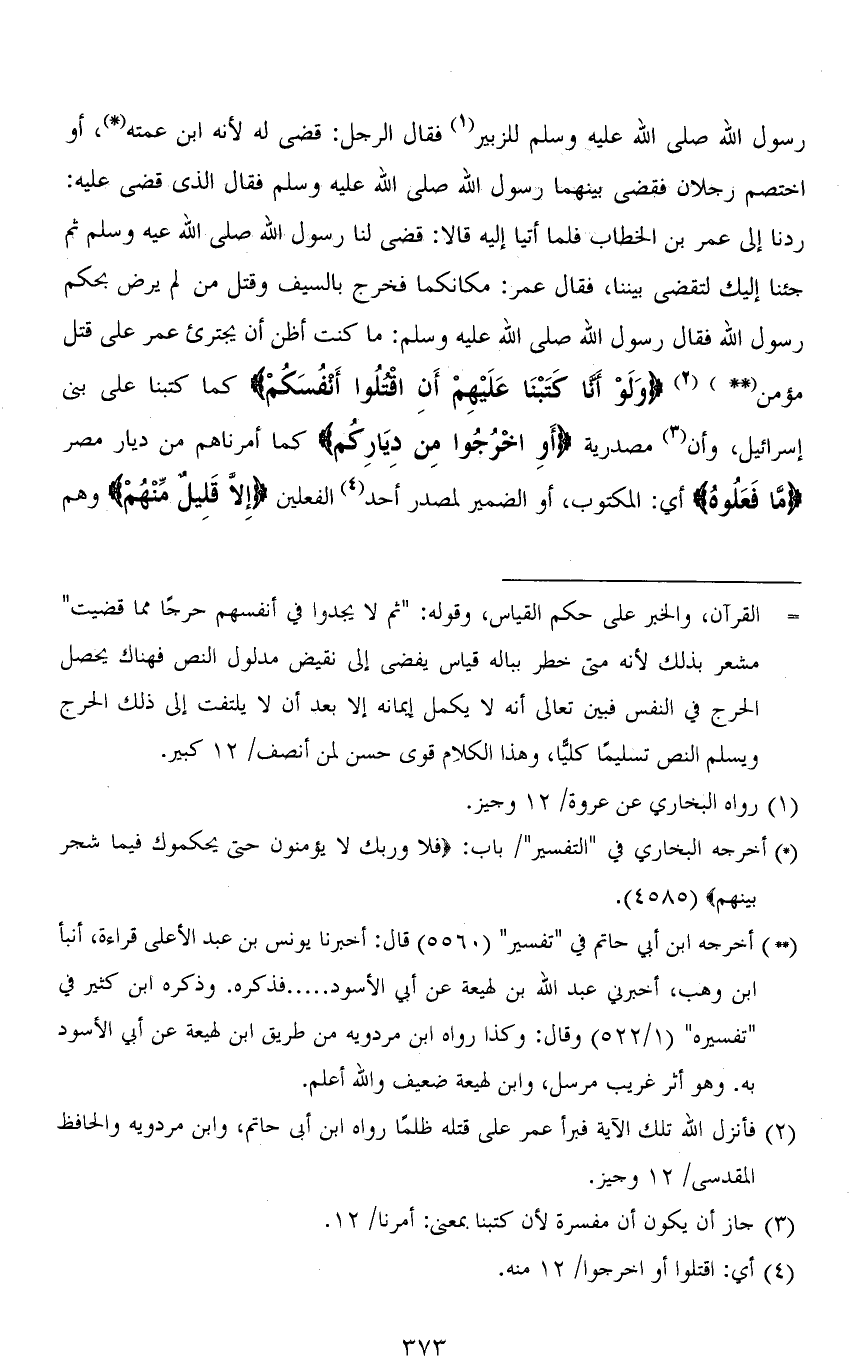رسول الله صلى الله عليه وسلم للزبير فقال الرجل: قضى له لأنه ابن عمته، أو اختصم رجلان فقضى بينهما رسول الله صلى الله عليه وسلم فقال الذي قضى عليه: ردنا إلى عمر بن الخطاب فلما أتيا إليه قالا: قضى لنا رسول الله صلى الله عيه وسلم ثم جئنا إليك لتقضي بيننا، فقال عمر: مكانكما فخرج بالسيف وقتل من لم يرض بحكم رسول الله فقال رسول الله صلى الله عليه وسلم: ما كنت أظن أن يجترئ عمر على قتل مؤمن " (وَلَوْ أَنَّا كَتَبْنَا عَلَيْهِمْ أَنِ اقْتُلُوا أَنْفُسَكُمْ) كما كتبنا على بني إسرائيل، وأن مصدرية (أَوِ اخْرُجُوا مِنْ دِيَارِكُمْ) كما أمرناهم من ديار مصر (ما فَعَلوهُ) أي: المكتوب، أو الضمير لمصدر أحد الفعلين (إِلَّا قَلِيلٌ مِنْهُمْ) وهم