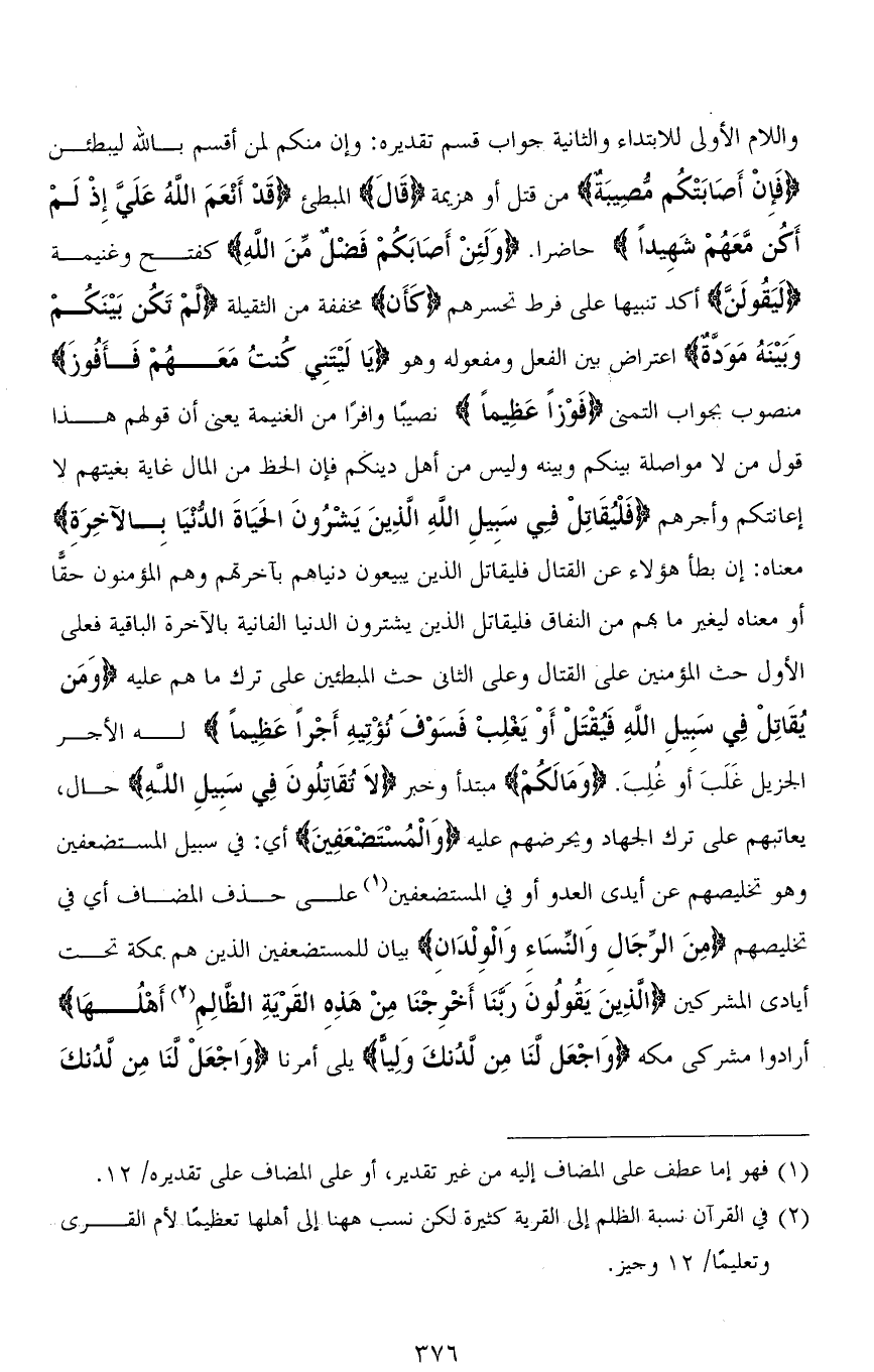 واللام الأولى للابتداء والثانية جواب قسم تقديره: وإن منكم لمن أقسم بالله ليبطئن (فَإِنْ أَصَابَتْكُمْ مُصِيبَةٌ) من قتل أو هزيمة (قَالَ) المبطئ (قَدْ أَنْعَمَ اللهُ عَلَيَّ إِذْ لَمْ أَكُنْ مَعَهُمْ شَهِيدًا) حاضرًا. (وَلَئِنْ أَصَابَكُمْ فَضْلٌ مِنَ اللهِ) كفتح وغنيمة (لَيَقُولَن) أكد تنبيهًا على فرط تحسرهم (كَأَنْ) مخففة من الثقيلة (لمْ تَكُن بَيْنَكُمْ وَبَيْنَهُ مَوَدَّةٌ) اعتراض بين الفعل ومفعوله وهو (يَا لَيْتَنِي كُنتُ مَعَهُمْ فَأَفُوزَ) منصوب بجواب التمني (فَوْزًا عَظِيمًا) نصيبًا وافرًا من الغنيمة يعني أن قولهم هذا قول من لا مواصلة بينكم وبينه وليس من أهل دينكم فإن الحظ من المال غاية بغيتهم لا إعانتكم وأجرهم (فَلْيُقَاتِلْ فِي سَبِيلِ اللهِ الَّذِينَ يَشْرُونَ الْحَيَاةَ الدُّنْيَا بِالْآخِرَةِ) معناه: إن بطأ هؤلاء عن القتال فليقاتل الذين يبيعون دنياهم بآخرتهم وهم المؤمنون حقًا أو معناه ليغير ما بهم من النفاق فليقاتل الذين يشترون الدنيا الفانية بالآخرة الباقية فعلى الأول حث المؤمنين على القتال وعلى الثاني حث المبطئين على ترك ما هم عليه (وَمَنْ يُقَاتِلْ فِي سَبِيلِ اللهِ فَيُقْتَلْ أَوْ يَغْلِبْ فَسَوْفَ نُؤْتِيهِ أَجْرًا عَظِيمًا) له الأجر الجزيل غَلَبَ أو غُلِبَ. (وَمَا لَكُمْ) مبتدأ وخبر (لَا تُقَاتِلُونَ فِي سَبِيلِ اللهِ) حال، يعاتبهم على ترك الجهاد ويحرضهم عليه (وَالْمُسْتَضْعَفِينَ) أي: في سبيل المستضعفين وهو تخليصهم عن أيدي العدو أو في المستضعفين على حذف المضاف أي فِي تخليصهم (مِنَ الرِّجَالِ وَالنِّسَاءِ وَالْوِلْدَانِ) بيان للمستضعفين الذين هم بمكة تحت أيادى المشركين (الَّذِينَ يَقُولُونَ رَبَّنَا أَخْرِجْنَا مِنْ هَذِهِ الْقَرْيَةِ الظَّالِمِ أَهْلُهَا) أرادوا مشركي مكة (وَاجْعَلْ لَنَا مِنْ لَدُنْكَ وَلِيًّا) يلي أمرنا (وَاجْعَلْ لَنَا مِنْ لَدُنْكَ