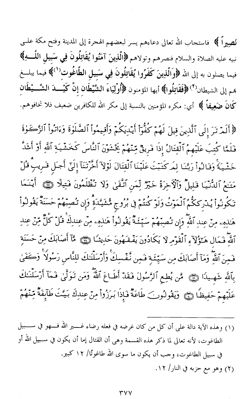 (أَلَمْ تَرَ إِلَى الَّذِينَ قِيلَ لَهُمْ كُفُّوا أَيْدِيَكُمْ وَأَقِيمُوا الصَّلَاةَ وَآتُوا الزَّكَاةَ فَلَمَّا كُتِبَ عَلَيْهِمُ الْقِتَالُ إِذَا فَرِيقٌ مِنْهُمْ يَخْشَوْنَ النَّاسَ كَخَشْيَةِ اللهِ أَوْ أَشَدَّ خَشْيَةً وَقَالُوا رَبَّنَا لِمَ كَتَبْتَ عَلَيْنَا الْقِتَالَ لَوْلَا أَخَّرْتَنَا إِلَى أَجَلٍ قَرِيبٍ قُلْ مَتَاعُ الدُّنْيَا قَلِيلٌ وَالْآخِرَةُ خَيْرٌ لِمَنِ اتَّقَى وَلَا تُظْلَمُونَ فَتِيلًا (77) أَيْنَمَا تَكُونُوا يُدْرِكْكُمُ الْمَوْتُ وَلَوْ كُنْتُمْ فِي بُرُوجٍ مُشَيَّدَةٍ وَإِنْ تُصِبْهُمْ حَسَنَةٌ يَقُولُوا هَذِهِ مِنْ عِنْدِ اللهِ وَإِنْ تُصِبْهُمْ سَيِّئَةٌ يَقُولُوا هَذِهِ مِنْ عِنْدِكَ قُلْ كُلٌّ مِنْ عِنْدِ اللهِ فَمَالِ هَؤُلَاءِ الْقَوْمِ لَا يَكَادُونَ يَفْقَهُونَ حَدِيثًا (78) مَا أَصَابَكَ مِنْ حَسَنَةٍ فَمِنَ اللهِ وَمَا أَصَابَكَ مِنْ سَيِّئَةٍ فَمِنْ نَفْسِكَ وَأَرْسَلْنَاكَ لِلنَّاسِ رَسُولًا وَكَفَى بِاللهِ شَهِيدًا (79) مَنْ يُطِعِ الرَّسُولَ فَقَدْ أَطَاعَ اللهَ وَمَنْ تَوَلَّى فَمَا أَرْسَلْنَاكَ عَلَيْهِمْ حَفِيظًا (80) وَيَقُولُونَ طَاعَةٌ فَإِذَا بَرَزُوا مِنْ عِنْدِكَ بَيَّتَ طَائِفَةٌ مِنْهُمْ