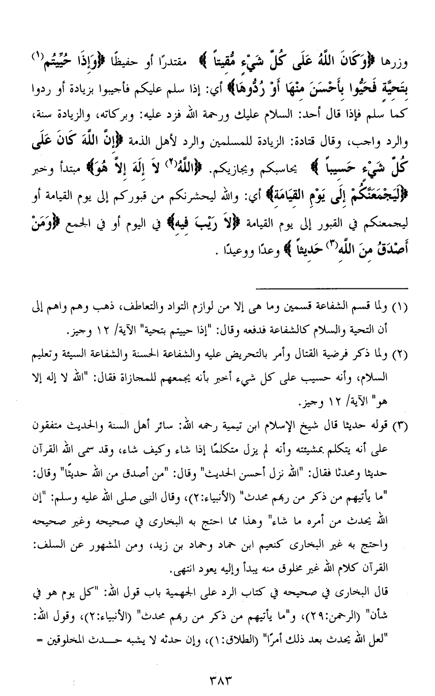 وزرها (وَكَانَ اللهُ عَلَى كُلِّ شَيْءٍ مُقِيتًا) مقتدرًا أو حفيظًا (وَإِذَا حُيِّيتُمْ بِتَحِيَّةٍ فَحَيُّوا بِأَحْسَنَ مِنْهَا أَوْ رُدُّوهَا) أي: إذا سلَّم عليكم فأجيبوا بزيادة أو ردوا كما سلَّم فإذا قال أحد: السلام عليك ورحمة الله فزد عليه: وبركاته، والزيادة سنة، والرد واجب، وقال قتادة: الزيادة للمسلمين والرد لأهل الذمة (إِنَّ اللهَ كَانَ عَلَى كُلِّ شَيْءٍ حَسِيبًا) يحاسبكم ويجازيكم. (اللهُ لَا إِلَهَ إِلَّا هُوَ) مبتدأ وخبر (لَيَجْمَعَنَّكُمْ إِلَى يَوْمِ الْقِيَامَةِ) أي: والله ليحشرنكم من قبوركم إلى يوم القيامة أو ليجمعنكم في القبور إلى يوم القيامة (لَا رَيْبَ فِيهِ) في اليوم أو في الجمع (وَمَنْ أَصْدَقُ مِنَ اللهِ حَدِيثًا) وعدًا ووعيدًا.
