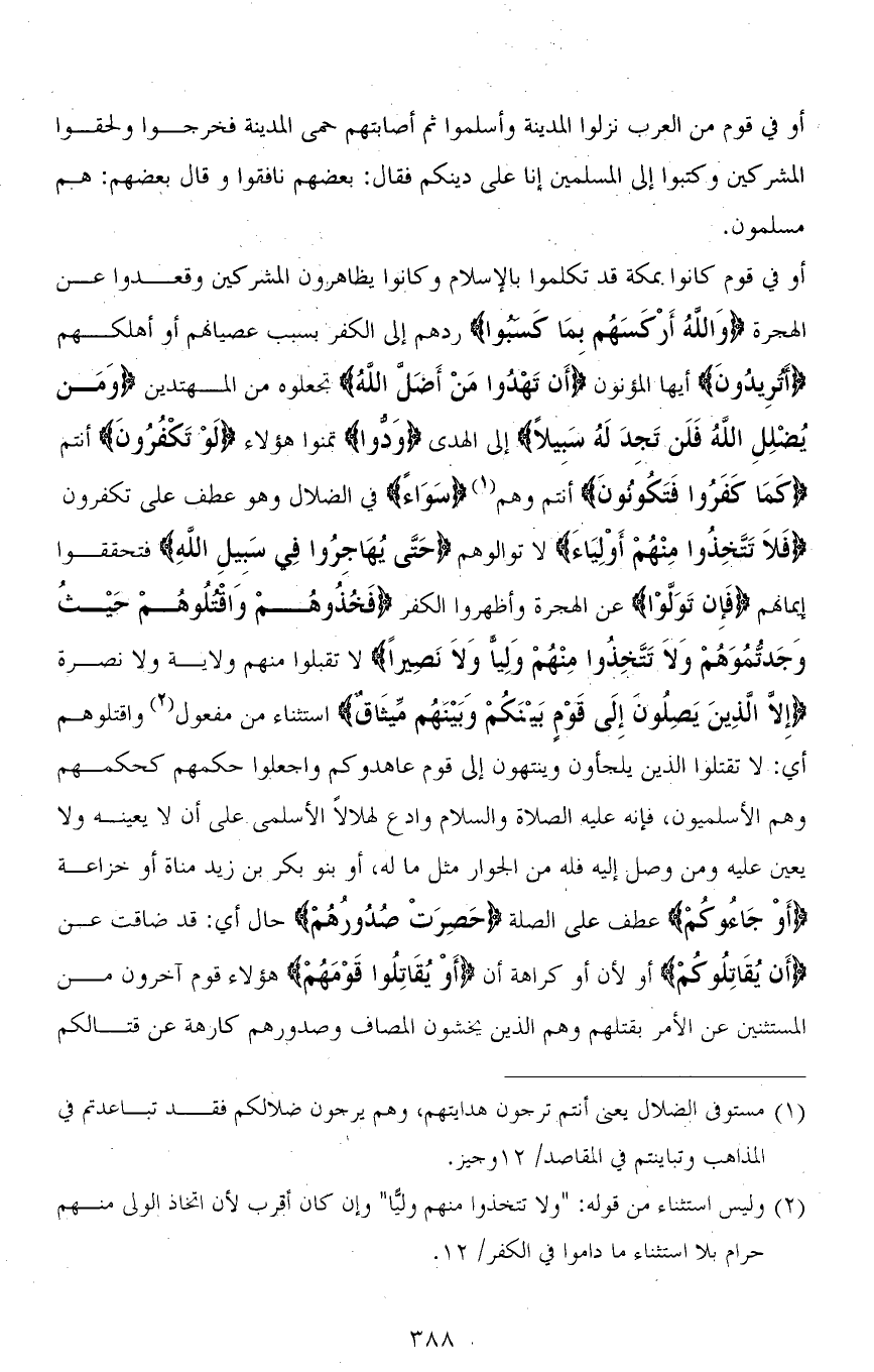 أو في قوم كانوا بمكة قد تكلموا بالإسلام وكانوا يظاهرون المشركين وقعدوا عن الهجرة (وَاللهُ أَرْكَسَهُمْ بِمَا كَسَبُوا) ردهم إلى الكفر بسبب عصيانهم أو أهلكهم (أَتُرِيدُونَ) أيها المؤمنون (أَنْ تَهْدُوا مَنْ أَضَلَّ اللهُ) تجعلوه من المهتدين (وَمَن يُضْلِلِ الله فَلَن تَجدَ لَهُ سَبِيلاً) إلى الهدى (وَدُّوا) تمنوا هؤلاء (لَوْ تَكْفُرُونَ) أنتم (كَمَا كَفَرُوا فَتَكُونُونَ) أنتم وهم (سَوَاءً) في الضلال وهو عطف على تَكْفُرُونَ (فَلاَ تَتَخِذُوا مِنْهُمْ أَوْلِيَاءَ) لا توالوهم (حَتَّى يُهَاجِرُوا فِي سَبِيلِ اللهِ) فتحققوا إيمانهم (فإِن تَوَلَّوْ ا) عن الهجرة وأظهروا الكفر (فَخُذُوهُمْ وَاقْتُلُوهُمْ حَيْثُ وَجَدْتُمُوهُمْ وَلَا تَتَّخِذُوا مِنْهُمْ وَلِيًّا وَلَا نَصِيرًا) لا تقبلوا منهم ولاية ولا نصرة (إِلَّا الَّذِينَ يَصِلُونَ إِلَى قَوْمٍ بَيْنَكُمْ وَبَيْنَهُمْ مِيثَاقٌ) استثناء من مفعول واقتلوهم أي: لا تقتلوا الذين يلجأون وينتهون إلى قوم عاهدوكم واجعلوا حكمهم كحكمهم وهم الأسلميون، فإنه عليه الصلاة والسلام وادع لهلالاً اللأسلمي على أن لا يعينه ولا يعين عليه ومن وصل إليه فله من الجوار مثل ما له، أو بنو بكر بن زيد مناة أو خزاعة (أَوْ جَاءُوكُمْ) عطف على الصلة (حَصِرَتْ صُدُورُهُمْ) حال أي: قد ضاقت عن (أَنْ يُقَاتِلُوكُمْ) أو لأن أو كراهة أن (أَوْ يُقَاتِلُوا قَوْمَهُمْ) هؤلاء قوم آخرون من المستثنين عن الأمر بقتلهم وهم الذين يخشون المصاف وصدورهم كارهة عن قتالكم