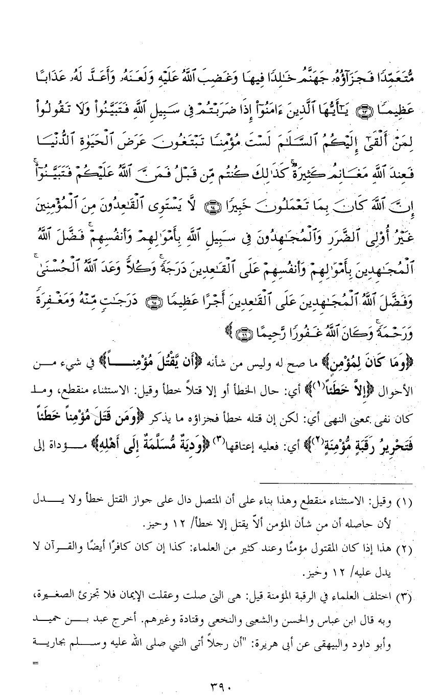 مُتَعَمِّدًا فَجَزَاؤُهُ جَهَنَّمُ خَالِدًا فِيهَا وَغَضِبَ اللهُ عَلَيْهِ وَلَعَنَهُ وَأَعَدَّ لَهُ عَذَابًا عَظِيمًا (93) يَا أَيُّهَا الَّذِينَ آمَنُوا إِذَا ضَرَبْتُمْ فِي سَبِيلِ اللهِ فَتَبَيَّنُوا وَلَا تَقُولُوا لِمَنْ أَلْقَى إِلَيْكُمُ السَّلَامَ لَسْتَ مُؤْمِنًا تَبْتَغُونَ عَرَضَ الْحَيَاةِ الدُّنْيَا فَعِنْدَ اللهِ مَغَانِمُ كَثِيرَةٌ كَذَلِكَ كُنْتُمْ مِنْ قَبْلُ فَمَنَّ اللهُ عَلَيْكُمْ فَتَبَيَّنُوا إِنَّ اللهَ كَانَ بِمَا تَعْمَلُونَ خَبِيرًا (94) لَا يَسْتَوِي الْقَاعِدُونَ مِنَ الْمُؤْمِنِينَ غَيْرُ أُولِي الضَّرَرِ وَالْمُجَاهِدُونَ فِي سَبِيلِ اللهِ بِأَمْوَالِهِمْ وَأَنْفُسِهِمْ فَضَّلَ اللهُ الْمُجَاهِدِينَ بِأَمْوَالِهِمْ وَأَنْفُسِهِمْ عَلَى الْقَاعِدِينَ دَرَجَةً وَكُلًّا وَعَدَ اللهُ الْحُسْنَى وَفَضَّلَ اللهُ الْمُجَاهِدِينَ عَلَى الْقَاعِدِينَ أَجْرًا عَظِيمًا (95) دَرَجَاتٍ مِنْهُ وَمَغْفِرَةً وَرَحْمَةً وَكَانَ اللهُ غَفُورًا رَحِيمًا (96)