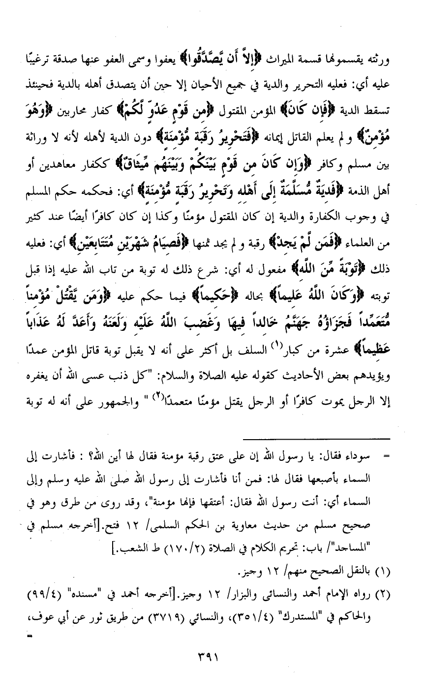 ورثته يقسمونها قسمة الميراث (إِلَّا أَنْ يَصَّدَّقُوا) يعفوا وسمي العفو عنها صدقة ترغيبًا عليه أي: فعليه التحرير والدية في جميع الأحيان إلا حين أن يتصدق أهله بالدية فحينئذ تسقط الدية (فَإِنْ كَانَ) المؤمن المقتول (مِنْ قَوْمٍ عَدُوٍّ لَكُمْ) كفار محاربين (وَهُوَ مُؤْمِنٌ) ولم يعلم القاتل إيمانه (فَتَحْرِيرُ رَقَبَةٍ مُؤْمِنَةٍ) دون الدية لأهله لأنه لا وراثة بين مسلم وكافر (وَإِن كاَنَ مِن قَوْمٍ بَيْنَكُمْ وَبَيْنهُم مِّيثَاقٌ) ككفار معاهدين أو أهل الذمة (فَدِيَةٌ مُسَلَّمَةٌ إِلَى أَهْلِهِ وَتَحْرِيرُ رَقَبَةٍ مُؤْمِنَةٍ) أي: فحكمه حكم المسلم في وجوب الكفارة والدية إن كان المقتول مؤمنًا وكذا إن كان كافرًا أيضًا عند كثير من العلماء (فَمَن لَمْ يَجِدْ) رقبة ولم يجد ثمنها (فَصِيَامُ شَهْرَيْنِ مُتَتَابِعَيْنِ) أي: فعليه ذلك (تَوْبَةً مِنَ اللهِ) مفعول له أي: شرع ذلك له توبة من تاب الله عليه إذا قبل توبته (وَكاَنَ اللهُ عَليماً) بحاله (حَكِيماً) فيما حكم عليه (وَمَنْ يَقْتُلْ مُؤْمِنًا مُتَعَمِّدًا فَجَزَاؤُهُ جَهَنَّمُ خَالِدًا فِيهَا وَغَضِبَ اللهُ عَلَيْهِ وَلَعَنَهُ وَأَعَدَّ لَهُ عَذَابًا عَظِيمًا) عشرة من كبار السلف بل أكثر على أنه لا يقبل توبة قاتل المؤمن عمدًا ويؤيدهم بعض الأحاديث كقوله عليه الصلاة والسلام: " كل ذنب عسى الله أن يغفره إلا الرجل يموت كافرًا أو الرجل يقتل مؤمنًا متعمدًا " والجمهور على أنه له توبة