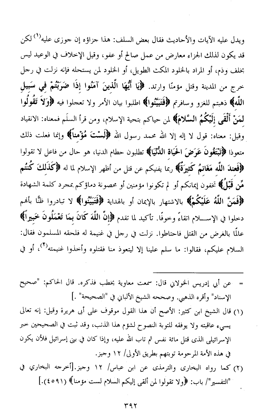 ويدل عليه الآيات والأحاديث فقال بعض السلف: هذا جزاؤه إن جوزي عليه لكن قد يكون لذلك الجزاء معارض من عمل صالح أو عفو، وقيل الإخلاف في الوعيد ليس بخلف وذم، أو المراد بالخلود المكث الطويل، أو الخلود لمن يستحله فإنه نزلت في رجل خرج من المدينة وقتل مؤمنًا وارتد. (يَا أَيُّهَا الَّذِينَ آمَنُوا إِذَا ضَرَبْتُمْ فِي سَبِيلِ اللهِ) ذهبتم للغزو وسافرتم (فَتَبَيَّنُوا) اطلبوا بيان الأمر ولا تعجلوا فيه (وَلاَ تَقُولُوا لِمَنْ أَلْقَى إلَيْكُم السَّلامَ) لمن حياكم بتحية الإسلام، ومن قرأ السَّلَم فمعناه: الانقياد وقيل: معناه: قول لا إله إلا الله محمد رسول الله (لَسْتَ مُؤْمِنًا) وإنما فعلت ذلك متعوذًا (تَبْتَغُونَ عَرَضَ الْحَيَاةِ الدُّنْيَا) تطلبون حطام الدنيا، هو حال من فاعل لا تقولوا (فَعِندَ اللهِ مَغَانِمُ كَثِيرَةٌ) ربما يفنيكم عن قتل من أظهر الإسلام لما له (كَذَلِكَ كنتم مِّن قَبلُ) تخفون إيمانكم أو لم تكونوا مؤمنين أو محصونة دماؤكم بمجرد كلمة الشهادة (فمَنَّ اللهُ عَلَيْكُمْ) بالاشتهار بالإيمان أو بالهداية (فَتَبَيَّنُوا) لا تبادروا ظنًّا بأنهم دخلوا في الإسلام اتقاءً وخوفًا. تأكيد لما تقدم (إِنَّ اللهَ كَانَ بِمَا تَعْمَلُونَ خَبِيرًا) عالمًا بالغرض من القتل فاحتاطوا. نزلت في رجل في غنيمة له فلحقه المسلمون فقال: السلام عليكم، فقالوا: ما سلم علينا إلا ليتعوذ منا فقتلوه وأخذوا غنيمته، أو في
